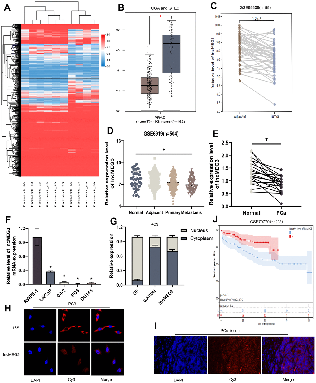 A growing number of studies have validated that lncRNAs exert notable effects on the advancement of tumors. We conducted sequencing and analysis on five pairs of PCa and adjacent normal tissues to examine variations in gene expression (Figure 1A). LncMEG3 was identified among these differential genes and further analyzed by TCGA-PRAD and GTEx database (Figure 1B). The expression level of lncMEG3 between PCa and adjacent tissues was also determined from the GEO database (GSE88808 n=98) (Figure 1C). According to the findings obtained from these databases, the expression level of lncMEG3 in tumor tissues was found to be lower compared to normal tissues. Moreover, it exhibited a declining tendency with the progression of PCa as indicated in the dataset GSE6919, which consisted of 504 samples (Figure 1D). To validate these outcomes, we expanded our study by including additional prostate cell lines and tissues. The data presented in Figure 1E, 1F clearly demonstrate that lncMEG3 expression was significantly lower in both PCa cells and tissues. To further investigate its cellular localization, we performed a cellular fractionation assay of RNA in PC3 cells. The results depicted in Figure 1G revealed that lncMEG3 was primarily located in the cytoplasm. Moreover, the FISH assays also confirmed these consistent findings (Figure 1H, 1I). The patients with lower levels of lncMEG3 were more likely to have biochemical recurrence according to the dates from GSE70770 (Figure 1J). Taken together, these findings demonstrate that lncMEG3 is specifically down-regulated and indicated a poor clinical prognosis in PCa.
