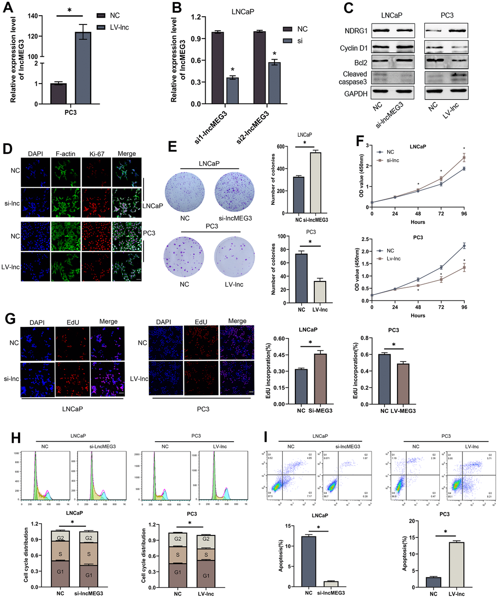 To verify the biological functions of lncMEG3 in PCa cells. SiRNA or lentivirus was transfected to change its expression in LNCaP and PC3 cells. qRT-PCR was utilized to identify the effect of transfection (Figure 2A, 2B). Colony forming assay indicated that elevating lncMEG3 inhibited the cell's ability to form colonies, and decreasing lncMEG3 increased the ability of cell clone formation (Figure 2E). CCK8 assays illustrated that overexpressing lncMEG3 markedly reduced the proliferation ability of PCa cells. Conversely, knocking down lncMEG3 increased cell proliferation (Figure 2F). Furthermore, EdU assays also implicated the same results (Figure 2G). Flow cytometry assays were conducted to evaluate the influence of lncMEG3 on the cell cycle and apoptosis of PCa. The findings demonstrated that the depletion of lncMEG3 led to a significant reduction in the number of cells in the G1 phase, along with an escalation in the S phase. (Figure 2H). As shown in Figure 2I, lncMEG3 upregulation significantly increased the percentage of apoptotic cells, while lncMEG3 downregulation indicated the opposite results. In addition, western blot analysis revealed that the levels of cell apoptosis-related proteins (Bcl-2, cleaved-caspase3) and cell cycle-associated protein (Cyclin D1) were significantly altered after lncMEG3 regulated (Figure 2C). Moreover, lncMEG3 level also affected the expression of ki-67, a proliferation-associated protein (Figure 2D). In summary, lncMEG3 can inhibit proliferation and increase apoptosis in PCa cells.