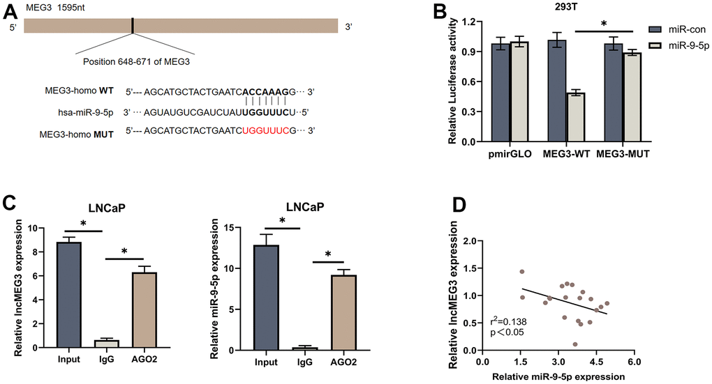 To evaluate whether lncMEG3, which is highly expressed in the cytoplasm, functions as a ceRNA in the progression of PCa. We further investigated its role as a platform for the catalytic subunit Argonaute 2 (AGO2) of the silencing complex (RISC). RIP assay indicated that lncMEG3 and miR-9-5p were markedly enriched by the AGO2 antibody (Figure 5C), suggesting that lncMEG3 and miR-9-5p may have interaction. Biological analyses (miRcode: http://www.mircode.org) also support that conclusion. Luciferase assays were performed to validate the binding capability of lncMEG3 (Figure 5A). When lncMEG3 luciferase reporters were cotransfected with miR-9-5p mimics into 293T cells, the luciferase activity was significantly reduced by approximately 50%. However, no significant change in fluorescence values was observed when mutated the target sites for miR-9-5p in the lncMEG3 luciferase reporter (Figure 5B). Moreover, 20 paired clinical samples were also demonstrated that lncMEG3 and miR-9-5p expression level was negatively correlated with each other (r2=0.138, P<0.05; Figure 5D).