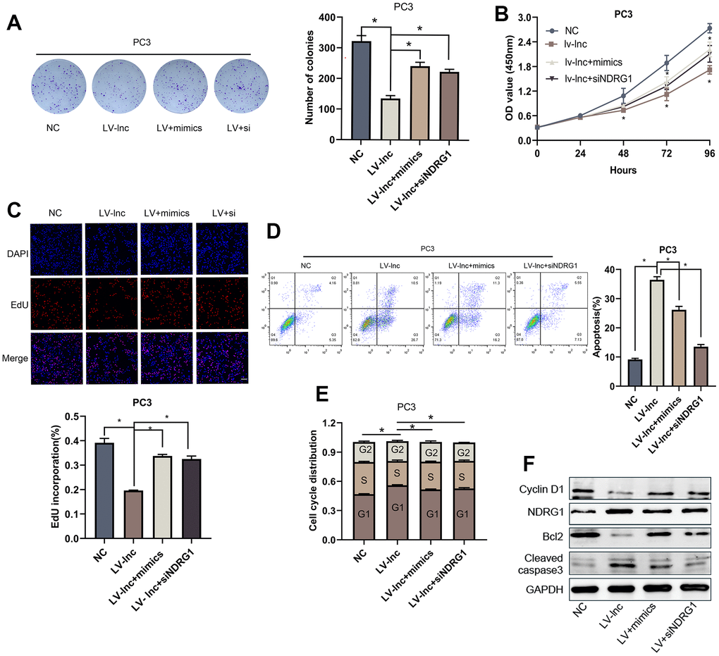 To investigate whether lncMEG3 exerts its function through miR-9-5p. Colony forming assay, CCK8 assays, and EdU assays were conducted after miR-9-5p mimics transfection. The results illustrated that miR-9-5p overexpression could significantly restore the suppressive effects of lncMEG3 upregulation on PCa cell proliferation abilities. Moreover, miR-9-5p mimics markedly restore the decreased cells in the G1 phase and the percentage of apoptotic cells. To confirm whether NDRG1 is essential for the effects of the lncMEG3 and miR-9-5p in PCa. Colony forming assays, CCK8 assays, and EdU assays were also conducted to observe tumor cell proliferation (Figure 6A–6C). Flow cytometry assays were applied to evaluate the effect on apoptosis and cell cycle (Figure 6D, 6E). The results illustrated that deprivation of NDRG1 substantially rescued the diminished proliferation of PCa cells caused by lncMEG3 overexpression. Moreover, western blotting analysis also implicated the levels of Bcl-2, Cyclin D1, and cleaved-caspase3 were significantly restored after miR-9-5p or NDRG1 regulated (Figure 6F). Taken together, these results indicate that lncMEG3 inhibits proliferation and promotes apoptosis in PCa cells by relieving the suppression effects of miR-9-5p on NDRG1.