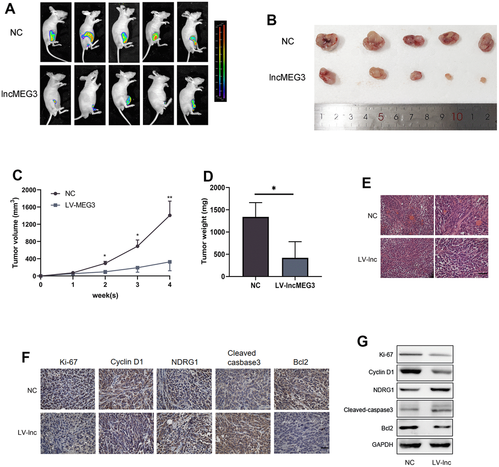 To identify the effect of lncMEG3 on PCa proliferation in vivo, we constructed lentiviral luciferin-labeled vectors overexpressing lncMEG3 in PC3 cells and then injected tumor cells subcutaneously into nude mice to establish xenograft models (n=5 per group). Strikingly, the upregulation of lncMEG3 significantly reduced the volume of tumor cells compared to the control group (Figure 7A, 7B). As presented in Figure 7C, 7D, there were also significant differences in tumor growth rate and weight between the two groups. In addition, hematoxylin and eosin (H&E) staining revealed that the tumor cells in the LV-lnc group were loosely arranged and had less vascularity compared with the control group (Figure 7E). Immunohistochemistry and western blot of tumor tissues demonstrated that upregulation of lncMEG3 markedly decreased the levels of ki-67, CyclinD1, and Bcl2, while increasing cleaved-caspase3 and NDRG1 (Figure 7F, 7G). Thus, these findings indicate that increasing lncMEG3 inhibits PCa proliferation and promotes apoptosis in vivo.