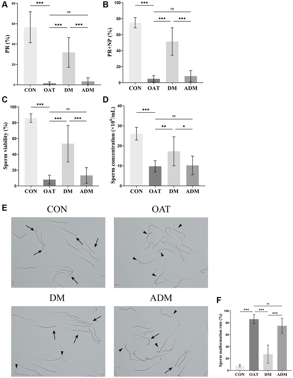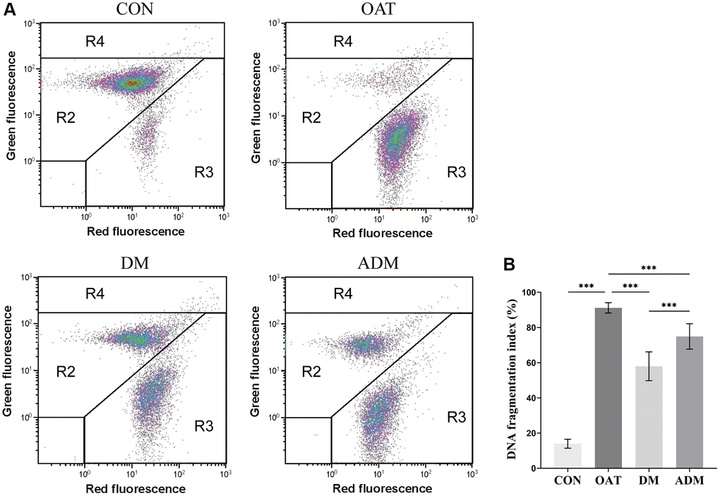 Sperm qualities, such as motility, viability, concentration, and malformation rate, determine the ability of male reproductive function [34]. The sperm DFI determines the fertilization ability of sperm, formation of prokaryotes, embryo implantation after fertilization, and offspring health. Semen routine analysis parameters cannot detect subtle DNA defects in sperm sterility or assess the integrity of sperm chromatin. Therefore, DFI is an independent indicator of semen quality [35]. Rats in the OAT group exhibited a significant decline in sperm quality in contrast with the CON group, consistent with the basic features of OAT [36]. Noteworthy, DM prevented the deterioration in sperm quality, while ADM was not very effective. However, both frequencies reduced sperm DFI.