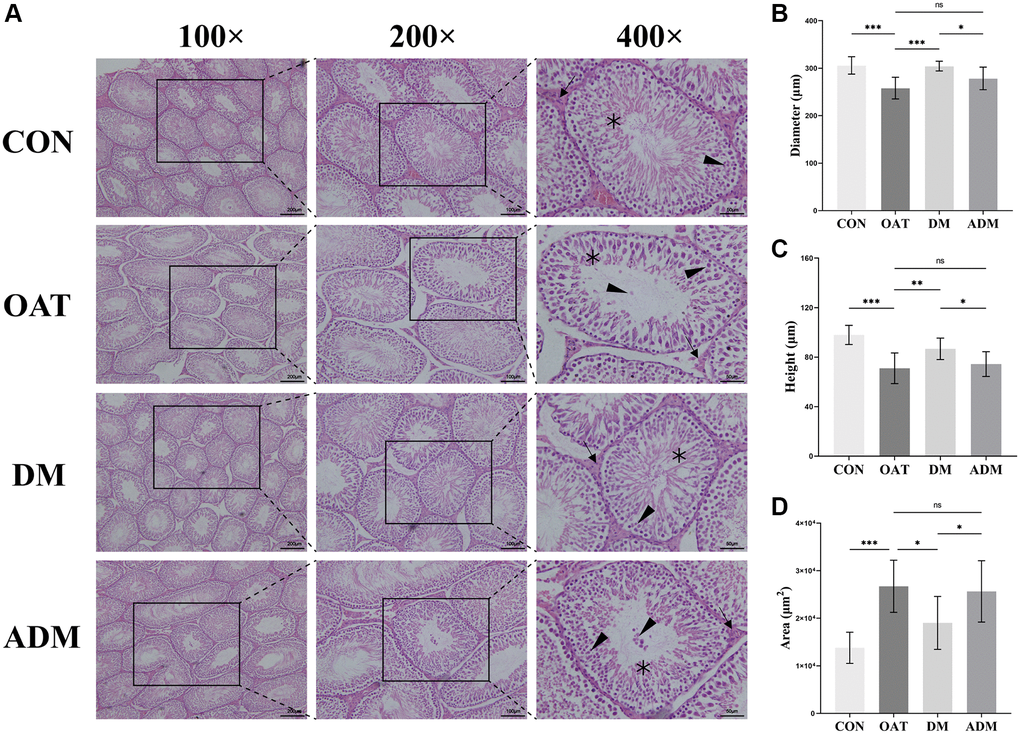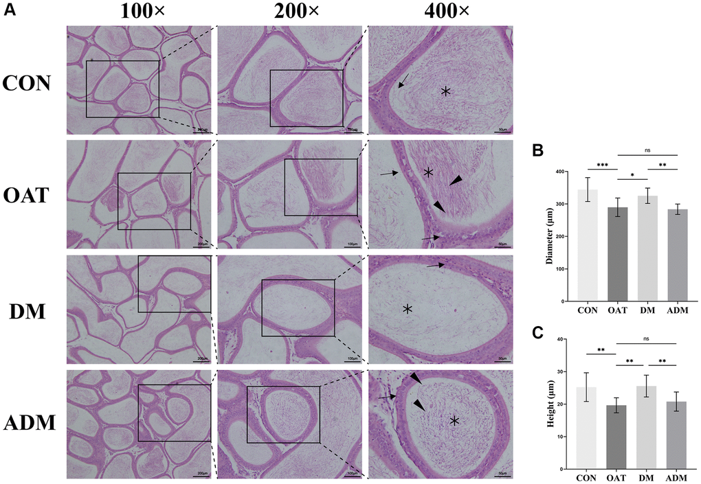 In addition, the extent of the seminiferous epithelium, the diameter of the seminiferous tubule, and the seminiferous tubule area were assessed to quantify the alterations in testicular histology. Compared with the CON group, the seminiferous tubule diameter and the seminiferous epithelium height in rats from the OAT group were significantly reduced (P < 0.001 for both; Figure 4B, 4C), and the area of seminiferous tubules was larger (P < 0.001; Figure 4D). In comparison with the OAT group, the seminiferous tubule diameter and the height of the seminiferous epithelium in rats from the DM group were significantly increased (P < 0.001 and P < 0.01, respectively; Figure 4B, 4C), and the seminiferous tubules area decreased (P < 0.05; Figure 4D). However, the ADM group did not exhibit a statistically significant enhancement in seminiferous tubules (P > 0.05; Figure 4B–4D).