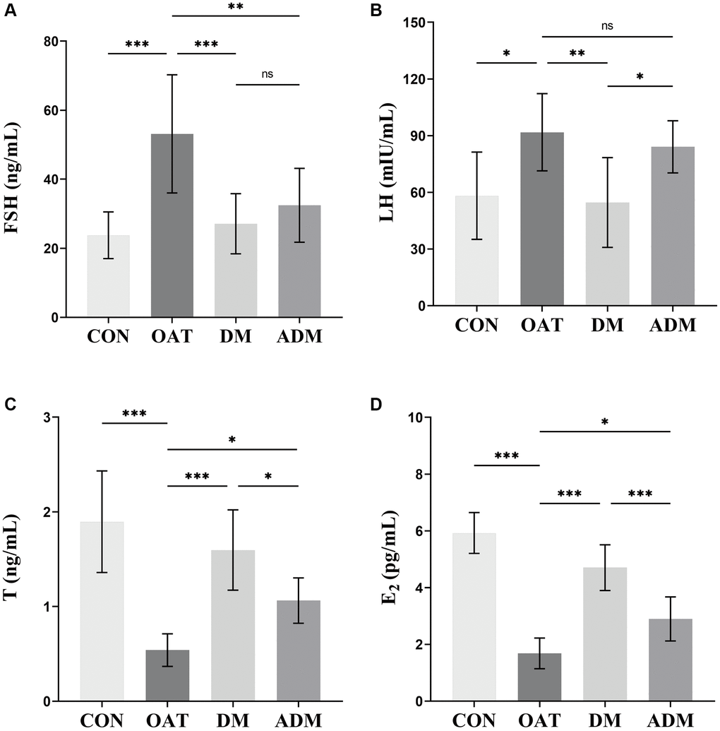 The regulation of testicular roles is primarily controlled by the neuroendocrine hypothalamo-hypophysial-gonadal axis feedback system, which is contingent upon the serum level of reproductive hormones; therefore, a decline in testicular function is directly reflected in hormone level disturbances [26]. As illustrated in Figure 6, the OAT group exhibited a significant rise in follicle-stimulating hormone (FSH) and luteinizing hormone (LH) serum levels in contrast to the CON group (P < 0.001 and P < 0.05, respectively, Figure 6A, 6B), while testosterone (T) and estradiol (E2) levels were decreased (P < 0.001 for both, Figure 6C, 6D). In contrast with the OAT group, the disturbed hormone levels were balanced in the DM group, as shown by the reduced serum levels of LH and FSH (P < 0.01 and P < 0.001, respectively) and increased levels of T and E2 (P < 0.001 for both). The FSH level also decreased (P < 0.01), while that of T and E2 increased (P < 0.05 and P < 0.05, respectively) in the ADM group. The DM group exhibited a better ability to regulate hormones than the ADM group.