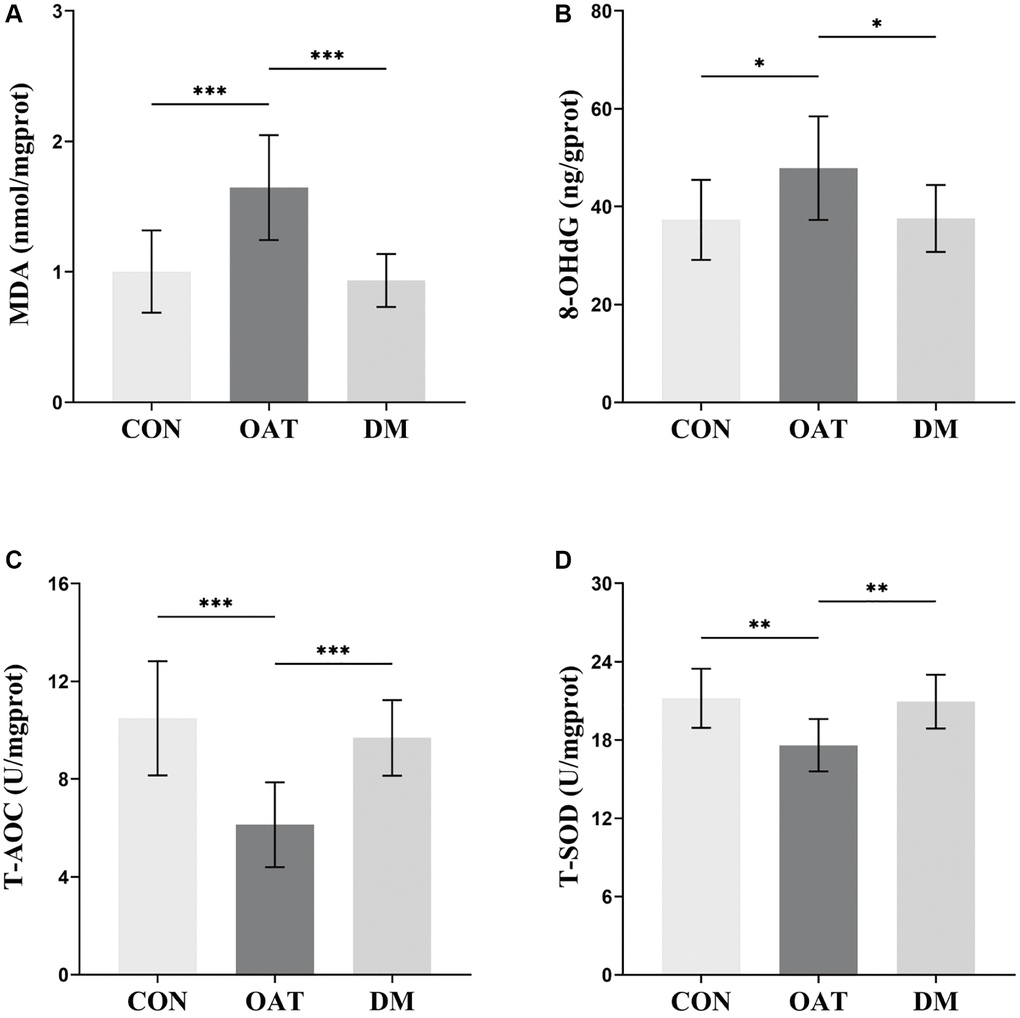 As presented in Figure 7, the testicular tissues of OAT group rats exhibited significantly high levels of MDA and 8-OHdG (P < 0.001 and P < 0.05, respectively, Figure 7A, 7B), but low levels of total antioxidant capacity (T-AOC) and total superoxide dismutase (T-SOD) (P < 0.001 and P < 0.01, respectively, Figure 7C, 7D) in contrast with the CON group. MDA and 8-OHdG levels in the testicular tissues of the DM group decreased (P < 0.001 and P < 0.05, respectively, Figure 7A, 7B), while T-AOC and T-SOD levels increased (P < 0.001 and P < 0.01, respectively, Figure 7C, 7D) compared with the OAT group.
