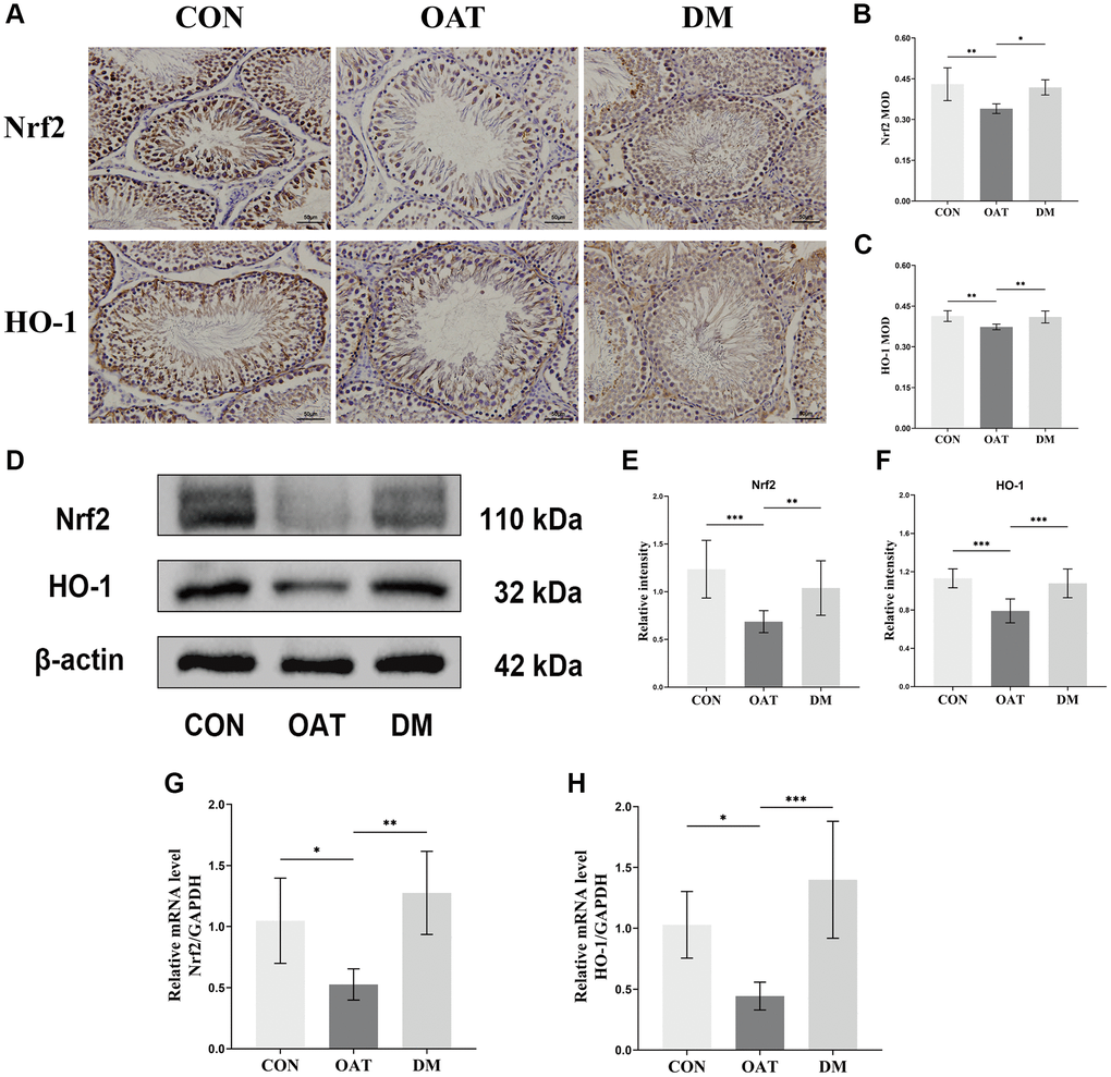 We examined whether the Nrf2/HO-1 signaling pathway was associated with the reduction of testicular OS by DM in OAT rats. The immunohistochemistry (IHC) of the testicular tissue revealed that Nrf2 and HO-1 were primarily expressed in Sertoli and spermatogenic cells (Figure 8A). Quantitative results were expressed as the MOD (Figure 8B, 8C); the OAT group had significantly lower HO-1 and Nrf2 expressions than the CON group (P < 0.01 for both), whereas those of the DM group were greater than those of the OAT group (P < 0.01, P < 0.05, respectively). The levels of Nrf2 and HO-1 protein expression detected by Western blotting are illustrated in Figure 8D. There were elevated Nrf2 and HO-1 protein expression levels in the DM group in contrast with the OAT group (P < 0.01 and P < 0.001, respectively; Figure 8E, 8F). The levels of Nrf2 and HO-1 mRNA expression detected using quantitative real-time PCR (qRT-PCR) are shown in Figure 8G, 8H. In contrast with the OAT group, the expression of Nrf2 and HO-1 mRNA was higher in the DM group (P < 0.01 and P < 0.001, respectively).