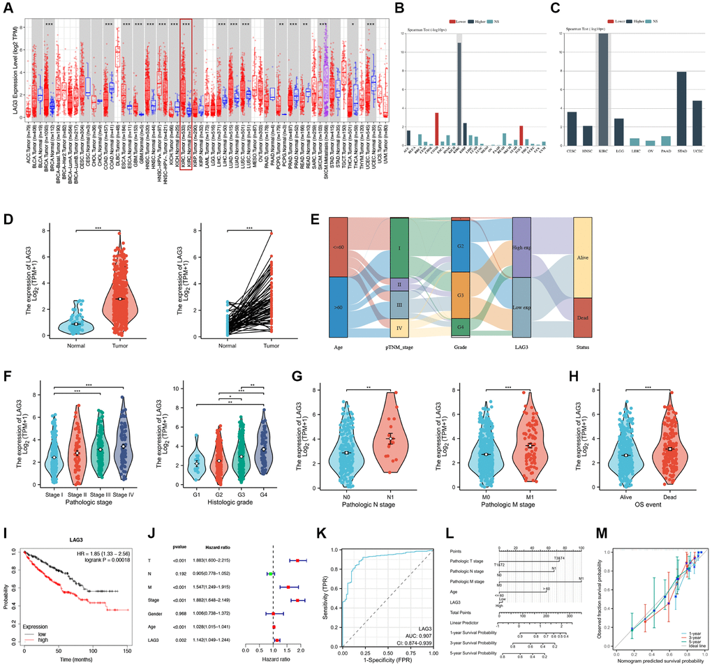 The TISIDB database was utilized to explore the association between LAG3 expression and clinical stage and grade of cancers. Notably, significant correlations between LAG3 expression and stage and grade were identified specifically in renal cancer (Figure 1B, 1C). Therefore, we focused on clarifying the functional role of LAG3 in KIRC. According to TCGA KIRC RNA-seq data, LAG3 was overexpressed in both paired and unpaired cancer tissues as compared to healthy controls (Figure 1D). To explore the clinical significance of LAG3 in KIRC, we initially investigated its expression pattern in relation to various clinical and pathological characteristics. We constructed Sankey plots to demonstrate trends in high and low LAG3 gene expression in KIRC patient samples with different clinical features and survival conditions (Figure 1E). The findings revealed elevated expression levels of LAG3 in advanced stages and higher grades KIRC (Figure 1F). Additionally, LAG3 overexpression was observed in lymph node metastasis and distant metastatic tissues when compared to normal tissues (Figure 1G). The same outcomes are demonstrated by detailed information regarding particular thresholds, namely that LAG3 high and low expression groups are statistically distinct in the T-stage, N-stage, M-stage, and AJCC-stage (Table 1).