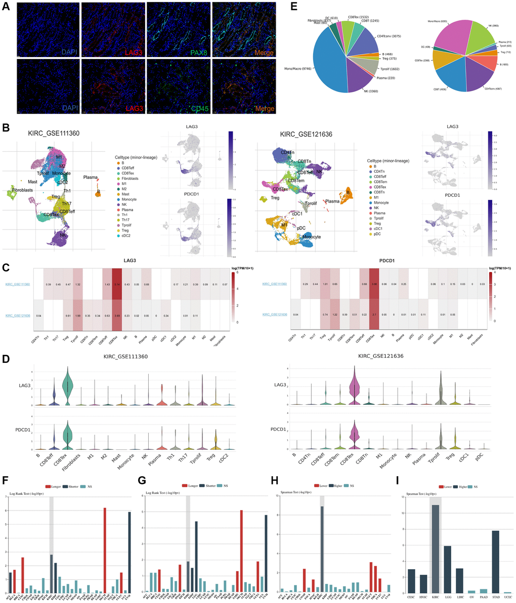 After identifying the elevated expression of LAG3 in KIRC, we further analyzed its expression in subcellular types. Through immunofluorescence experiments, we observed that LAG3 expression is observed in immune cells (CD45+ cells) rather than in tumor cells (PAX8+ cells) (Figure 2A). To precisely identify the immune cell types expressing LAG3, we probed the cell-type localization of LAG3 expression in KIRC using two single-cell datasets. In both datasets, LAG3 was found to be expressed mainly on exhausted CD8+ T cells (CD8Tex cells) rather than on tumor cells or other types of immune cells compared and was also co-expressed with PDCD1(Figure 2B–2D). The pie charts show that CD8Tex occupies a non-negligible proportion of the KIRC immune cell composition (Figure 2E). Using the TISIDB database, we found that the expression patterns of LAG3 and PDCD1 showed similar association with OS, clinical stage, and grade in KIRC (Figure 2F–2I).