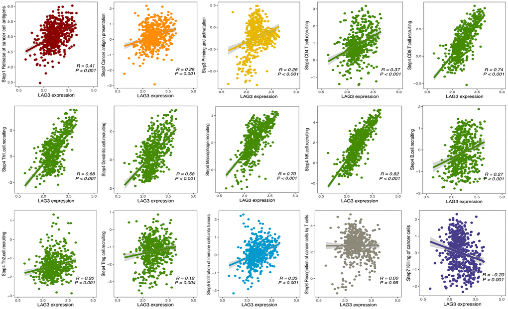 Previous reports have shown that various chemokines and immunomodulators modulate the activity of the cancer-immunity cycle [16]. Therefore, we investigated a potential association of LAG3 with the cancer-immunity cycle in KIRC. We found that LAG3 expression was positively correlated with most immunity cycle activities, especially the trafficking of immune cells to tumors (step 4). LAG3 expression was strongly correlated with recruitment of CD8+ T cells (r = 0.74), NK cells (r = 0.82), macrophages (r = 0.70), and Th1 cells (r = 0.68), intermediately correlated with recruitment of dendritic cells (r = 0.58), and weakly correlated with recruitment of CD4+ T cells (r = 0.37), Th2 cells (r = 0.12), Treg cells (r = 0.12), B cells (r = 0.27). In accordance with our hypothesis, a negative correlation was observed between LAG3 expression and the efficacy of cancer cell eradication (step 7) (Figure 4), which confirmed its role as an inhibitory immune checkpoint that suppresses immune surveillance. Consistently, these results also revealed the role of LAG3 in promoting TIICs infiltration and shaping the inflammatory TME in KIRC.