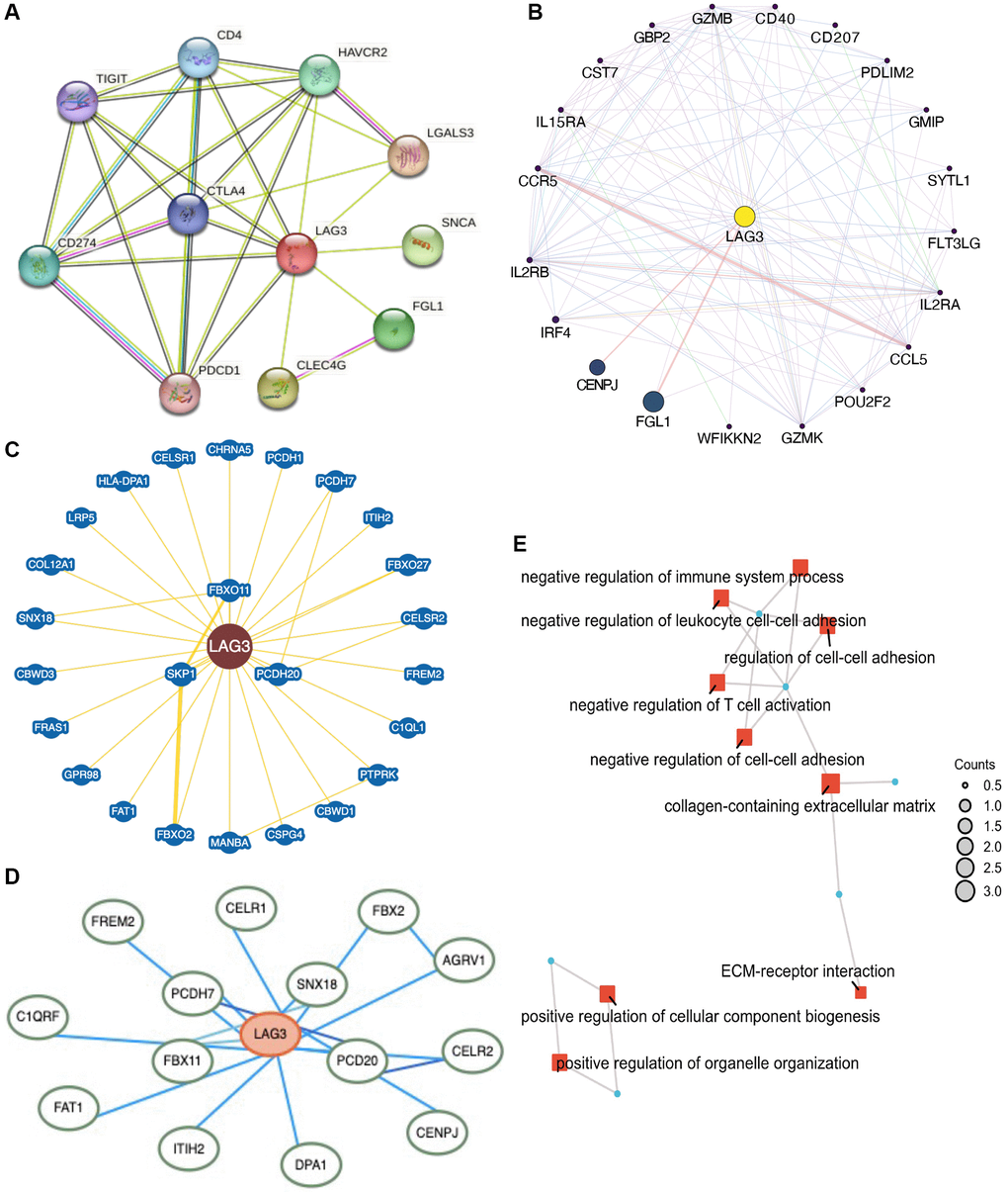 Genes co-expressed with LAG3 were obtained by searching the STRING, GeneMANIA, BioGRID, and HitPredict databases [35–37]. After screening the recurring genes, eight LAG3-related genes were identified. Gene ontology (GO) and Kyoto Encyclopedia of Genes and Genomes (KEGG) enrichment analyses were conducted to investigate the function of the LAG3-dominated gene interaction network using “clusterProfiler” package in R software.