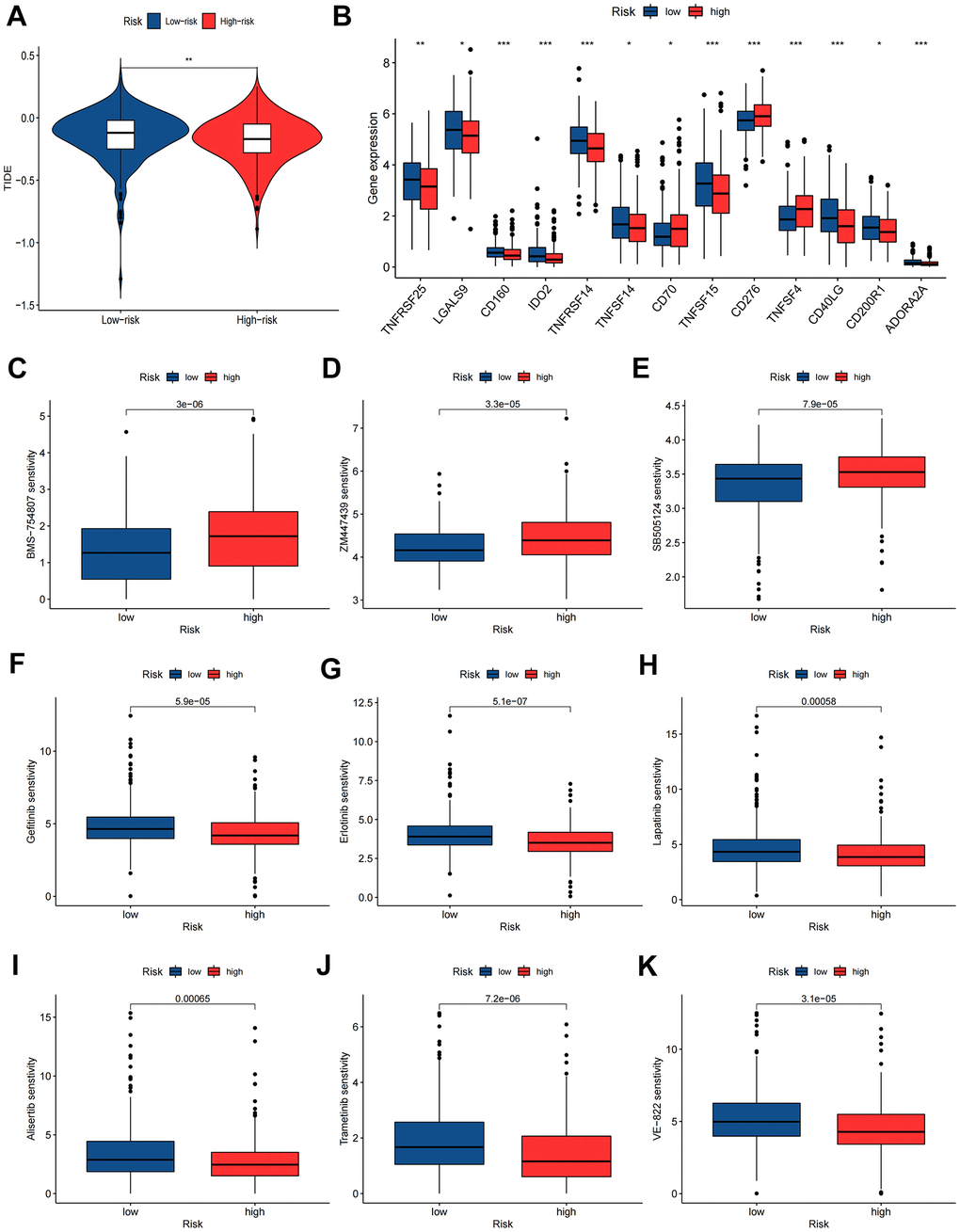 According to the results of the TIED algorithm, tumor cells in the low-risk group appeared more easily to be immune escapees (Figure 10A). Gene expression analyses of immune checkpoints indicated that the highly expressed immune checkpoint genes were TNFRSF25, LGALS9, CD160, IDO2, TNFRSF14, TNFSF14, TNFSF15, CD40LG, CD200R1 and ADORA2A in the low-risk group and CD70, CD276 and TNFSF4 in the high-risk group (Figure 10B). Drug sensitivity analyses revealed that low-risk group patients had 6 sensitive drugs, and the pharmacological action of these drugs is mainly by interdicting the PI3K/MTOR and ERK MAPK signaling pathways (Supplementary Table 7). The high-risk group had 59 sensitive drugs, and the pharmacological effect was mainly mediated by blocking mitosis and the IGF1R signaling pathway (Supplementary Table 8 and Figure 10C–10K).