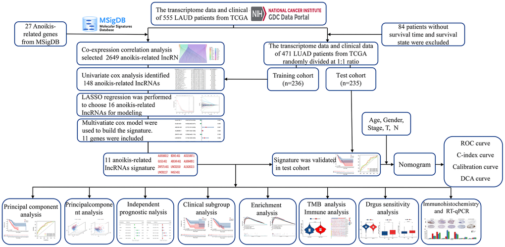 Clinical information and gene expression messages of 555 (506 LUAD samples) samples were downloaded from The Cancer Genome Atlas (TCGA) on September 3, 2022 (https://portal.gdc.cancer.gov/). Thirty-five LUAD samples with no survival time, survival condition or complete gene information were further excluded, and 471 patients with full clinical information were enrolled in the TCGA-LUAD cohort. Then, the cohort was randomly assigned to training (236 samples) and test (235 samples) cohorts at a ratio of 1:1 (Table 1). Construct a prognostic signature using the most valuable ARlncRNAs filtered from the training cohort data. TCGA-LUAD and test cohorts were utilized to test the predictability and clinical applicability of the signature. The data processing flow is detailed in Figure 2. Statistical analyses were performed with R software (version 4.2.3).