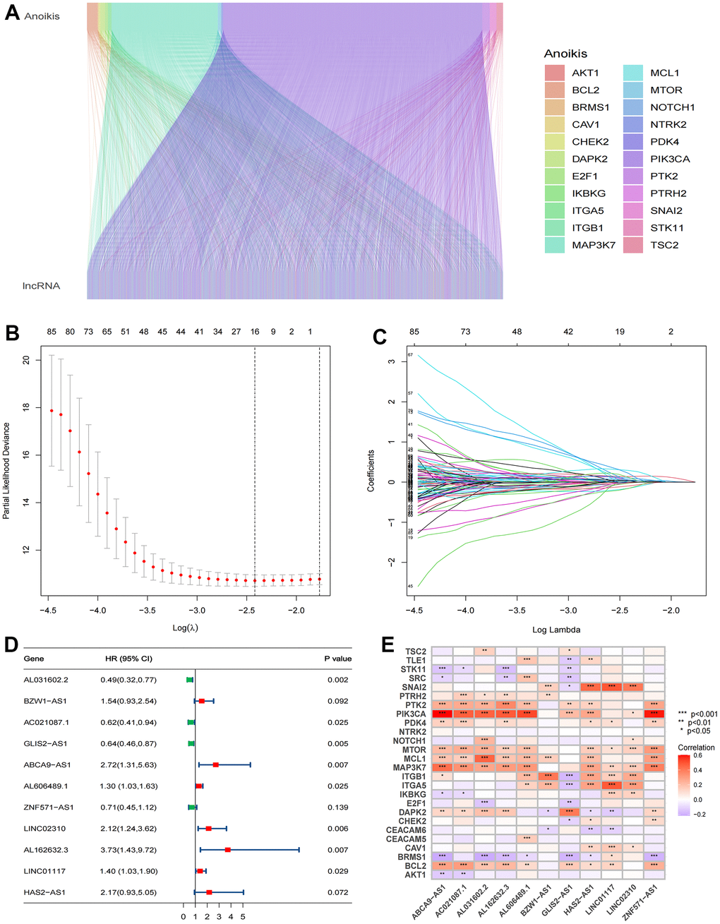 Twenty-seven anoikis-related genes were acquired from the Molecular Signatures Database (MSigDB) [14]. Coexpression analysis in the “limma” R package was used to screen potential ARlncRNAs between anoikis-related genes and lncRNAs (|R| >0.4; P < 0.001).