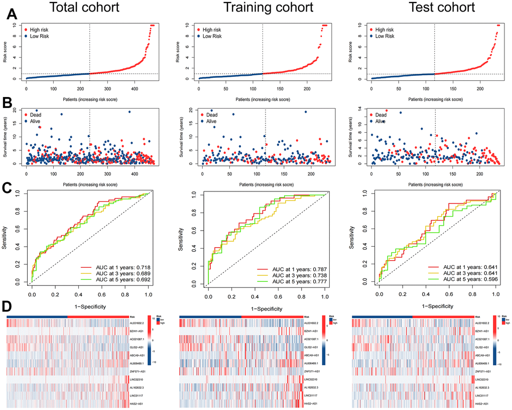The analysis process of this research is displayed in a flow chart (Figure 2). First, 2649 ARlncRNAs were screened by coexpression analysis of 16,876 lncRNAs associated with 27 anoikis-related genes. Then, coexpression analysis results between anoikis-related genes and ARlncRNAs expressed by a Sankey diagram were obtained (Figure 3A). Next, combining the clinical data of patients in the training cohort, 148 ARlncRNAs associated with OS were identified among 2678 ARlncRNAs by univariate Cox regression analysis (Supplementary Table 2). Furthermore, 16 ARlncRNAs were significantly associated with prognosis from the above lncRNAs using LASSO regression analysis (Figure 3B, 3C). Finally, we identified 11 significant prognostic ARlncRNAs in LUAD patients via multivariate Cox regression analysis (Figure 3D). A correlation heatmap showed the relationship between 11 ARlncRNAs and anoikis-related genes (Figure 3E). The multivariate Cox regression analysis coefficient of ARlncRNAs is shown in Supplementary Table 3. Then, the risk scores of different patients will be counted according to the risk score formula, risk score = (Exp AL031602.2 × -0.71045017820589) + (Exp BZW1-AS1 × 0.432038348321673) + (Exp AC021087.1 × -0.476411291926875) + (Exp GLIS2-AS1 × -0.454008732783369) + (Exp ABCA9-AS1 × 0.999706491359515) + (Exp AL606489.1 × 0.259835252523394) + (Exp ZNF571-AS1 × -0.34874860401809) + (Exp LINC02310 × 0.75089202544965) + (Exp AL162632.3 × 1.31557357109109) + (Exp LINC01117 × 0.338762422003907) + (Exp HAS2-AS1 × 0.775846321855369). The Exp was the expression of lncRNA in different patients. According to the median risk score, patients were divided into the high-risk and the low-risk groups. The results of the risk scores and risk groups for each patient in the total, training and test cohorts are shown in Supplementary Tables 4–6.
