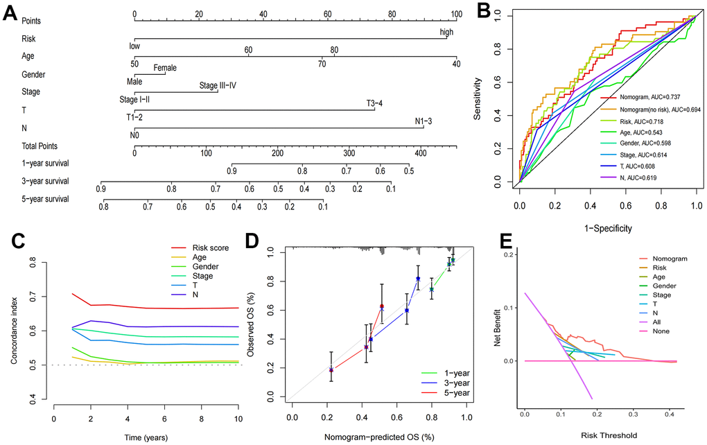 Cox regression analysis indicated that T stage (P=0.010), N stage and risk score (P<0.001) were independent prognostic factors (Table 3 and Supplementary Figure 1A, 1B). In addition, correlation analysis revealed that stage (P=0.0019), sex (P=0.001), T stage (P=0.00072), and N stage (P<0.0001) had significant relationships with risk scores, while age (P=0.88) was not significantly related to risk scores (Supplementary Figure 1C–1G). Finally, we developed a new nomogram with risk scores and clinical characteristics for predicting the OS of LUAD patients at 1, 3 and 5 years (Figure 6A). The ROC curve results showed that the risk score (AUC: 0.718) had better predictive ability than age (0.543), sex (0.598), stage (0.614), T stage (0.608) and N stage (0.619) (Figure 6B), which was also indicated by the C-index curves (Figure 6C). The nomogram with risk score had more accurate predictive prognostic ability compared to no risk scores (AUC: 0.737 vs. 0.694, Figure 6B), which precisely forecasted the OS of patients in the test cohort (Supplementary Figure 2). Calibration curves show the agreement between the predicted and actual outcomes, and DCA demonstrated the clinical applicability value of this model (Figure 6D, 6E).