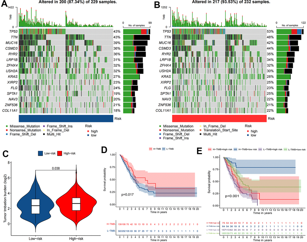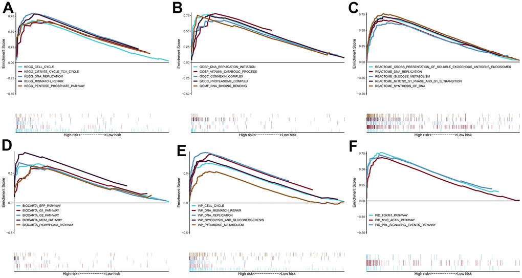 Enrichment results for six different pathway bases showed that glucose metabolism and DNA replication were the main enrichment pathways in the high-risk group. Notably, there was no significant enrichment pathway in the low-risk group (Figure 7). Depending on the results of the maftools algorithm, waterfall plots show that the mutation frequency of most genes was markedly increased in the high-risk group, such as TP53, TTN, MUC16, etc. (Figure 8A, 8B). Furthermore, the high-risk group was significantly linked to a high TMB. (Figure 8C). Survival analysis based on TMB results showed that the high TMB group had good OS compared to the low TMB group (Figure 8D, 8E).