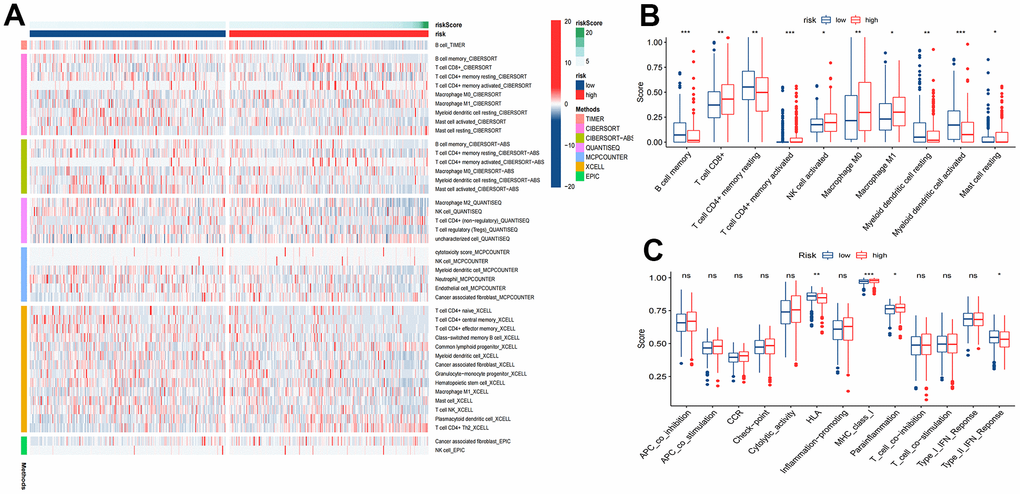 Most immune cell infiltration levels were noticeably dissimilar in the two risk groups, as shown by the heatmap (Figure 9A). Wilcoxon analysis showed significantly lower infiltration rates of activated myeloid dendritic cells and B-cell memory in the high-risk group. In contrast, the infiltration rates of M0 macrophages and CD8+ T cells were significantly higher (Figure 9B). Moreover, immune function analysis demonstrated that 4 (HLA, MHC class I, parainflammation, type II IFN response) immune function pathways were significantly different between the two risk groups (Figure 9C).