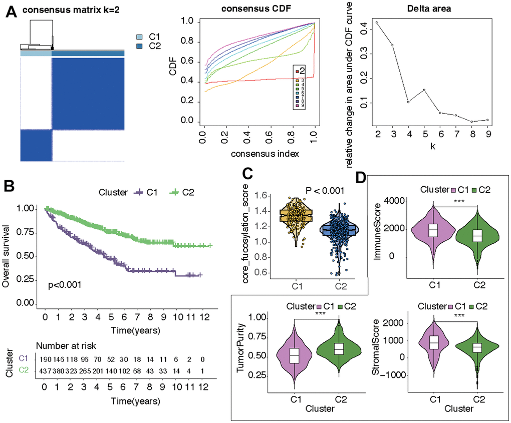 Subsequent sections involved comprehensive analyses aimed at delving into the potential significance of core fucosylation (CF) in the context of KIRC. The “ConsensusClusterPlus” packages in R was utilized to identify distinct KIRC subtypes. The various features between different KIRC subtypes were further explored. First, the “survival” package was utilized to plot the survival curves. Then the “ssgsea” function in “GSVA” package was chosen to estimate the state of CF. Broadly speaking, the “estimate” package was employed to evaluate aspects like tumor purity, immune activity, and stromal characteristics. As for estimating the TME specifically, the following approaches were utilized: (1) multiple algorithms including XCELL, MCPCOUNTER, CIBERSORT, CIBERSORT-ABS, EPIC, and TIMER were applied respectively to assess immune responses [34]; (2) the immune-related processes were estimated by “‘ssGSEA”; (3) the expression levels of common ICGs were collected and compared; (4) the condition of signaling pathways, encompassing those pertinent to immunity and metabolism, was gauged using the “ssgsea” method; (5) the states of common cell deaths were also estimated through “ssgsea”. Finally, the drug sensitivity in different KIRC subtypes was investigated by “oncoPredict”. Of note, the exploration of all the discrepancies between different KIRC subtypes was utilized “wilcox.test”.