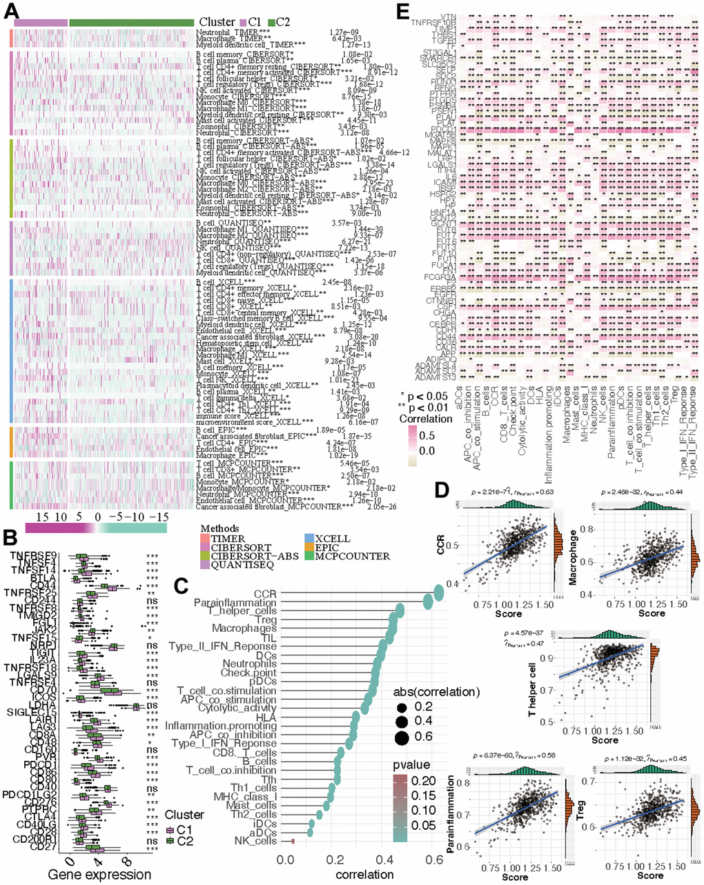 First, the immune responses within the two subtypes were scrutinized, revealing dissimilarities in the levels of immune cell infiltration between them. Neutrophils, macrophages, myeloid dendritic cells, B cells, and T cell CD4+ memory activated were more active in C1, while mast cells, NK cells, and endothelial cells were more active in C2 (Figure 3A). As for the ICGs, the discrepancies between the two KIRC subtypes were shown in Figure 3B. Compared with C1, the expression of most ICGs (i.e., TNFRSF9, TNFSF4, TNFSF14, BTLA, CD44, TNFRSF25, TNFRSF8, TMIGD2, FGL1, TIGIT, IL23A, TNFRSF18, LGALS9, CD70, ICOS, SIGLEC15, LAIR1, LAG3, CD8A, CD48, PVR, PDCD1, CD86, CD80, PDCD1LG2, CD276, PTPRC, CTLA4, CD40LG, CD28, CD27) were decreasing while JAK2 and TNFSF15 had higher expression in C2. Certainly, the immune-related processes and immune cells were correlated with the state of CF. CCR and parainflammation were strongly correlated with CF score (r>0.5, p<0.05) and Cytolytic activity, APC co-stimulation, T cell co-stimulation, pDCs, checkpoints, Neutrophils, DCs, Type II IFN Response, TIL, Macrophages, Treg, and T helper cells were moderately correlated with CF score(r>0.3, p<0.05) (Figure 3C, 3D). Furthermore, the correlations between CF-related hub genes and the immune-related processes were explored. It was shown in Figure 3E that the expression levels of FCGR3A and PDCD1 had strong positive correlations with almost all immune processes. The expression of SELP was strongly correlated with Type II IFN Response. In addition, the expression of FUT7 displayed a substantial positive correlation with several factors, including TIL, pDCs, T cell co-stimulation, chemokine receptor (CCR), check points, T helper cells, Th1 cells, and inflammation-promoting (r>0.5, p<0.05).