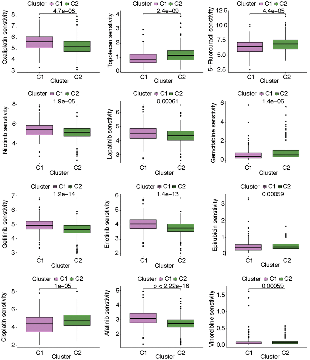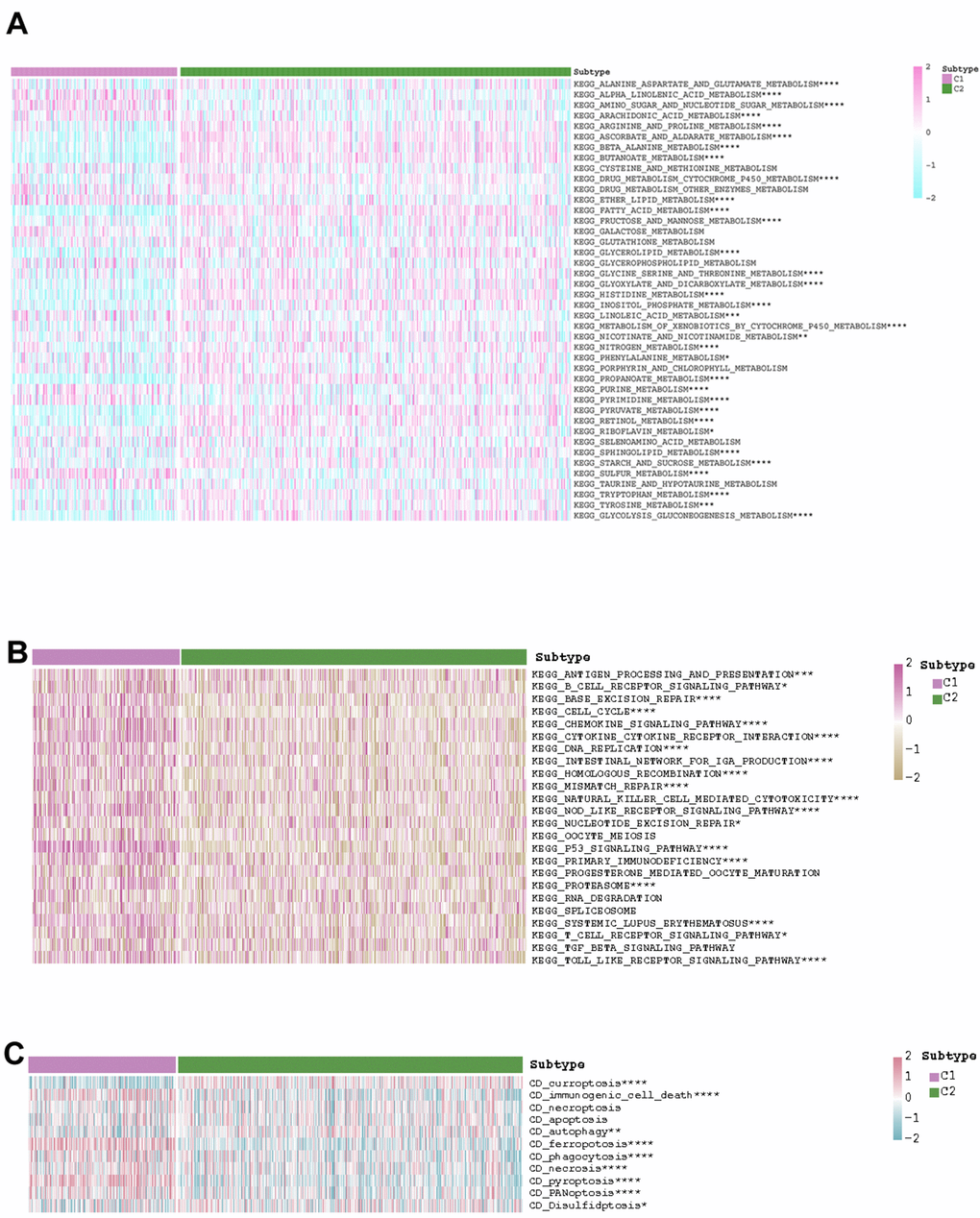 After estimating the pathway activity, the discrepancies of the metabolism- and immune-related pathways and cell deaths were shown in the form of heatmap. In C1, the activities of alpha linolenic acid metabolism, amino sugar and nucleotide sugar metabolism, arachidonic acid metabolism, ether lipid metabolism, purine metabolism, pyrimidine metabolism, taurine and hypotaurine metabolism, and sulfur metabolism were up-regulated. In C2, the activities of arginine and proline metabolism, ascorbate and aldarate metabolism, beta alanine metabolism, butanoate metabolism, fatty acid metabolism, glycerolipid metabolism, glyoxylate and dicarboxylate metabolism, histidine metabolism, inositol phosphate metabolism, propanoate metabolism, pyruvate metabolism, retinol metabolism, glycolysis gluconeogenesis metabolism, and mTOR signaling pathway metabolism were up-regulated (Figure 4A). As for immune-related pathway, we found that the increasing activities of almost all immune-related pathways (i.e., antigen processing and presentation, B cell receptor signaling pathway, base excision repair, cell cycle, chemokine signaling pathway, cytokine cytokine receptor interaction, DNA replication, intestinal network for iga production, homologous recombination, mismatch repair, natural killer cell mediated cytotoxicity, NOD like receptor signaling pathway, nucleotide excision repair, oocyte meiosis, p53 signaling pathway, primary immunodeficiency, progesterone mediated oocyte maturation, proteasome, RNA degradation, spliceosome, systemic lupus erythematosus, T cell receptor signaling pathway, TGF beta signaling pathway, Toll like receptor signaling pathway) existed in C1 (Figure 4B). The state of cell death in the two subgroups also differed from each other. The state of curroptosis was more active in C2 while the state of immunogenic cell death, ferropotosis, phagocytosis, necrosis, pyroptosis, and PANoptosis were more active in C1 (Figure 4C). What’s more, the two KIRC subtypes showed distinct drug sensitivities. Samples in C2 may be more sensitive to vinorelbine, epirubicin, cisplatin, 5-fluorouracil, gemcitabine, and topotecan, while samples in C1 may be more sensitive to gefitinib, erlotinib, lapatinib, nilotinib, oxaliplatin, and afatinib (Figure 5).