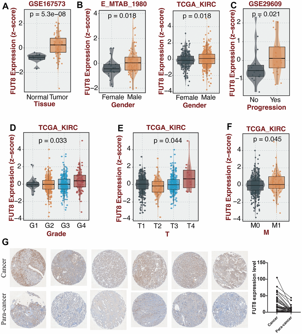 FUT8, as the key regulator of CF, has the highest correlation score with CF in GeneCards. In view of the distinct features of CF in the two KIRC subtypes, the molecular features of FUT8 in KIRC were further investigated. Compared with normal samples, FUT8 had obviously higher expression in KIRC based on GSE167573 dataset (Figure 6A). Also, the expression level of FUT8 was found to be elevated in male KIRC patients compared to female patients, as evidenced by the data from both the E_MTAB_1980 and TCGA datasets (Figure 6B). In addition, its expression level was increasing in those KIRC samples with tumor progression based on GSE29609 dataset (Figure 6C). The expression of FUT8 showed highest level in G4 samples based on the TCGA dataset (p<0.05) (Figure 6D). As for T and M grade, we found that samples with T4 grade or M1 grade had the obviously high expression level of FUT8 based on TCGA dataset (Figure 6E, 6F). Subsequently, IHC revealed the expression level of FUT8 in KIRC and para-cancer tissues. Clearly, FUT8 exhibited higher IHC scores in KIRC compared to para-cancer tissues (p<0.05) (Figure 6G).