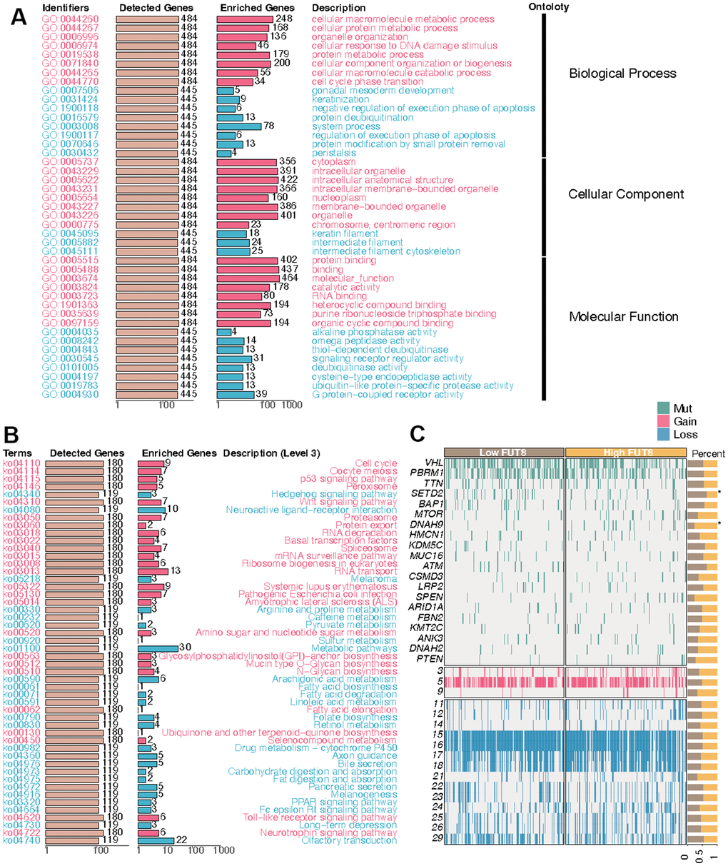 Having designated FUT8 as the input variable, an over-representation analysis was conducted to identify the genes most closely linked to FUT8. Then the genes correlated with FUT8 were obtained and collected to carry out GSEA. First, the GO bar chart demonstrated that these genes exhibited enrichment across numerous biological processes (i.e., cellular macromolecule metabolic process, cellular protein metabolic process, organelle organization, cellular response to DNA damage stimulus, protein metabolic process), cellular component (i.e., cytoplasm, intracellular organelle, intracellular anatomical structure, intracellular membrane-bounded organelle, nucleoplasm), and molecular function (i.e., protein binding, molecular function, catalytic activity, RNA binding, heterocyclic compound binding) (Figure 7A). Then the KEGG bar chart suggested that these FUT8-related genes were correlated with many biological processes, such as cell cycle, p53 signaling pathway, hedgehog signaling pathway, wnt signaling pathway, mRNA surveillance pathway, arginine and proline metabolism, amino sugar and nucleotide sugar metabolism, arachidonic acid metabolism, drug metabolism-cytochrome P450, PPAR signaling pathway, and Toll-like receptor signaling pathway (Figure 7B). Additionally, with the increase of FUT8 expression, the genomics landscape of the TCGA-KIRC dataset was displayed in Figure 7C. We observed a higher frequency of SETD2 mutations within the low-FUT8 group and the mutation of DNAH9 was more frequent in high-FUT8 group.