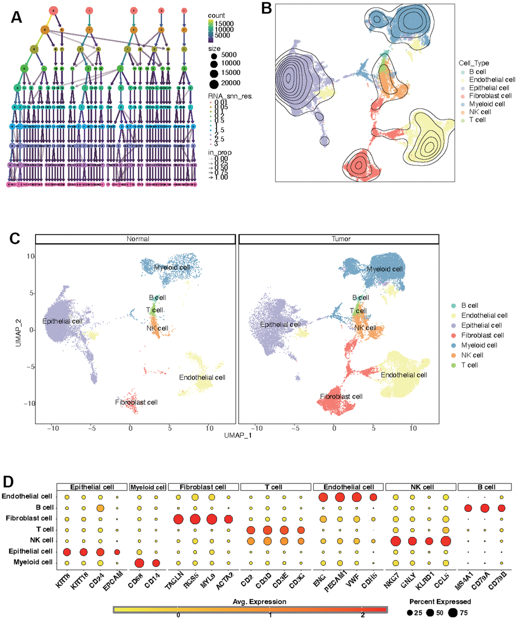 Further analysis of the scRNA-seq data (GSE156632) was performed to unveil the CF state in KIRC and normal samples. Following quality control (Supplementary Figure 1), all cells were grouped into 50 clusters (Figure 8A and Supplementary Figure 2A, 2B). Subsequently, these clusters were categorized into distinct cell types based on specific cell markers (Figure 8B–8D and supplementary Figure 2C). The CF state was evaluated in each cell type. It suggested that the CF state is notably active in endothelial and fibroblast cells (Figure 9A). The CF state of each cell type between KIRC and normal samples was compared, revealing statistical discrepancies in myeloid, epithelial, NK, T, fibroblast, and endothelial cells (Figure 9B, 9C).