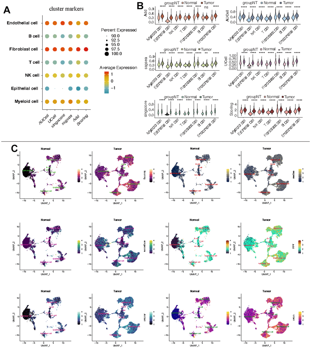 KIRC scRNA-seq data (GSE156632) were retrieved from the GEO database and analyzed using the standard protocols of Seurat. Cells with less than 200 or more than 6500 count features were excluded, and cells with a mitochondrial RNA percentage exceeding 10% were also removed. Subsequently, the data underwent normalization and scaling for PCA analysis. The harmony package was employed to mitigate batch effects, and the “FindClusters” function was utilized to cluster cells at an optimal resolution. UMAP was employed for data visualization. Using typical cell-type markers, all subpopulations were identified and annotated. The CF state was assessed using five widely recognized algorithms: GSVA, UCell, singscore, Add, and AUCell. Importantly, the scores from the aforementioned five algorithms were aggregated to derive a total score, referred to as “Scoring.” Subsequently, the “wilcox.test” was employed to compare the CF state between KIRC and normal samples within each single-cell subpopulation.