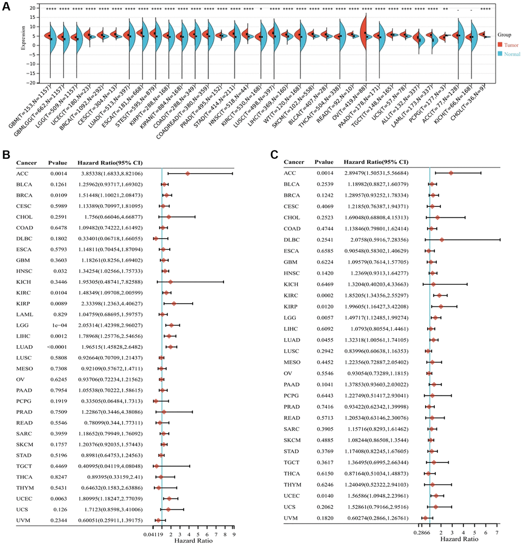 Utilizing clinical information contained in the TCGA database, we selected two markers (OS and PFS) to characterize the survival duration and prognosis of patients with a variety of malignancies. Estimating the association between ALG3 levels and patients’ prognoses utilizing forest plots was demonstrated to be effective. Eventually, survival analysis was implemented utilizing Kaplan–Meier curves, which were applied to the data of certain malignancies that had statistical significance.