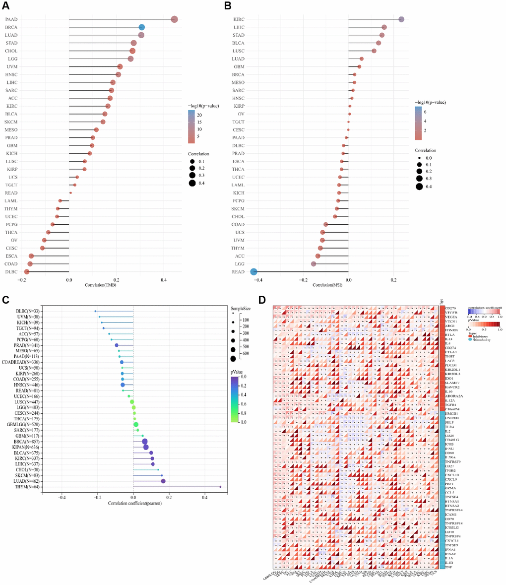 Analysis of the correlation between ALG3 and TMB, MSI, and immune checkpoint genes in pan-cancer