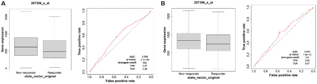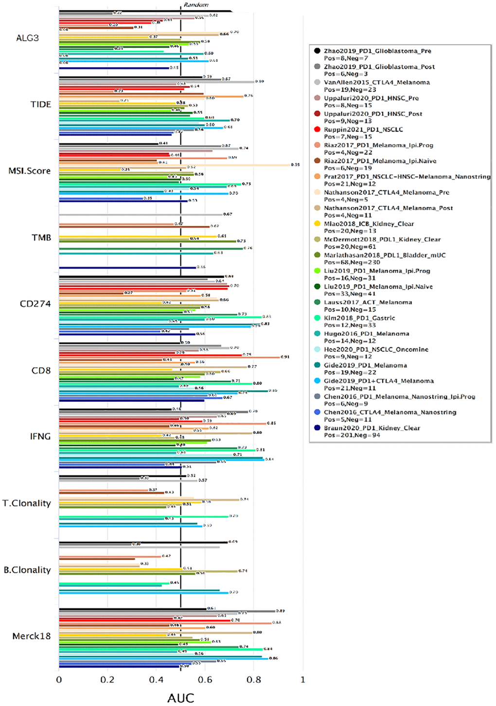 The above data implicated that ALG3 may be an effective indicator for immune checkpoint blockade. We evaluated the significance of ALG3 as a biological marker by contrasting its levels of expression with that of standardized biomarkers premised on the prediction performance of response outcomes and OS of ICB sub-cohorts. This was done by utilizing the Tumor Immune Dysfunction and Exclusion database (http://tide.dfci.harvard.edu/). Notably, we discovered that ALG3 independently exhibited an area under the receiver operating characteristic curve (AUC) of >0.5 in 11 of the 21 ICB cohorts. ALG3 exhibited a higher predictive value than TMB, T. Clonality, and B. Clonality. However, ALG3 was comparable to the MSI score, CD274, CD8, IFNG, TIDE and Merck18 in predication (Figure 3).