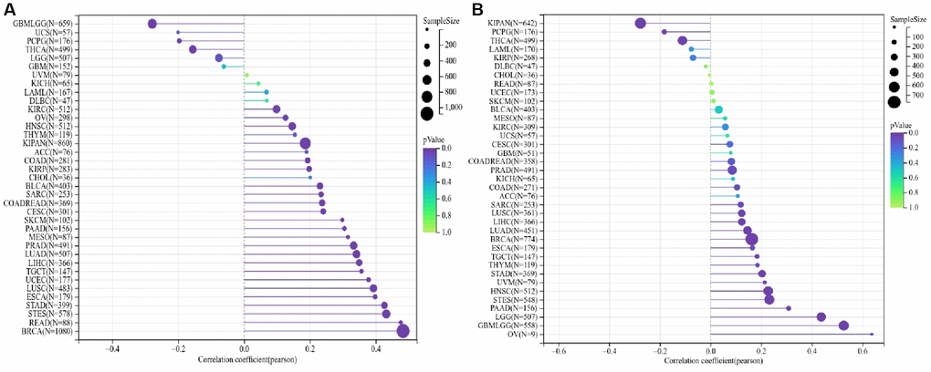 During the progression of cancer, tumor cells may lose their differentiated phenotype steadily and gain characteristics similar to those of progenitor and stem cells. Both RNA stemness score, which is premised on mRNA expression (RNAss), and DNA stemness score (DNAss), which is dependent on the patterns of DNA methylation, may be utilized to quantify the stemness of a tumor. DNAss is the dryness index derived based on methylation data while RNAss is the stemness indices calculated based on expression data. When the stemness index is closer to 1, the degree of cell differentiation tends to be lower, whereas the stem cells’ characteristics become stronger. We examined whether or not there was a link between the ALG3 genes and the stemness of the tumor, as estimated by DNAss and RNAss. ALG3 was shown to have varying degrees of relationship with RNAs and DNAs, depending on the kind of cancer (Figure 4A, 4B).