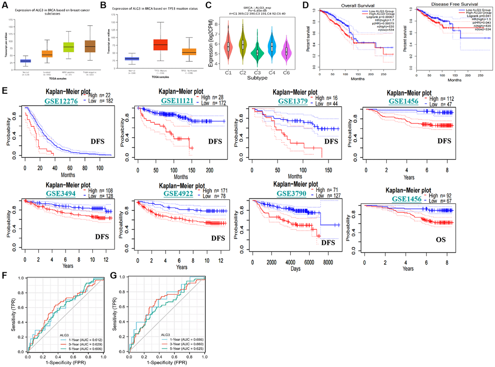 Subsequently, we evaluated whether ALG3 expression level was correlated with clinical-pathological parameters, and prognostic significance. The elevated expression level of ALG3 was found in breast cancer, especially in HER-2 positive and triple negative breast cancer, as revealed by the UALCA database (Figure 5A). An elevated level of ALG3 expression was considerably linked to TP53 mutant status (Figure 5B).