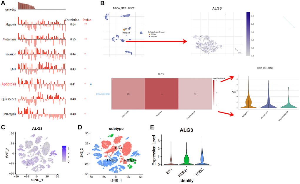 The biological function and the fundamental processes of ALG3 in breast cancer were investigated. A single-cell transcriptome sequencing investigation illustrated that ALG3 expression was substantially related to hypoxia, metastasis, invasion, EMT, apoptosis, quiescence, and DNA repair in breast cancer. The inhibition of ALG3 activity resulted in a decrease in the growth rate of breast cancer cells.