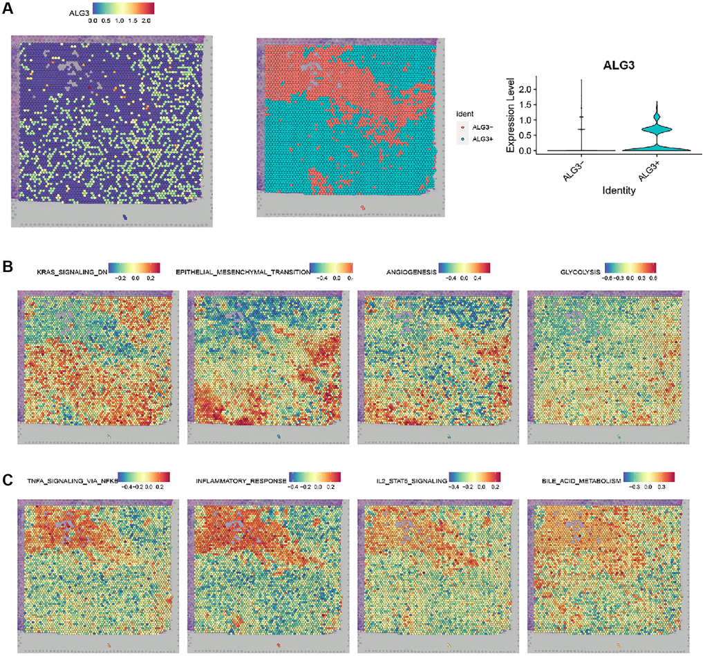 To gain insights into the association of ALG3 expression level and significant pathways, we performed spatially resolved transcriptomics on breast cancer samples. Figure 7A showed the expression level of ALG3 in breast cancer samples. The subclusters was identified as ALG3+ and ALG3-, as shown in Figure 7B. The analysis revealed that ALG3 was positively associated with the GSVA scores of pathways that were involved in breast cancer progression, such as KRAS signaling, EMT, TNF α signaling pathways. Interestingly, ALG3 was positively associated with the GSVA scores of bile acid and glycolysis metabolism (Figure 7C).