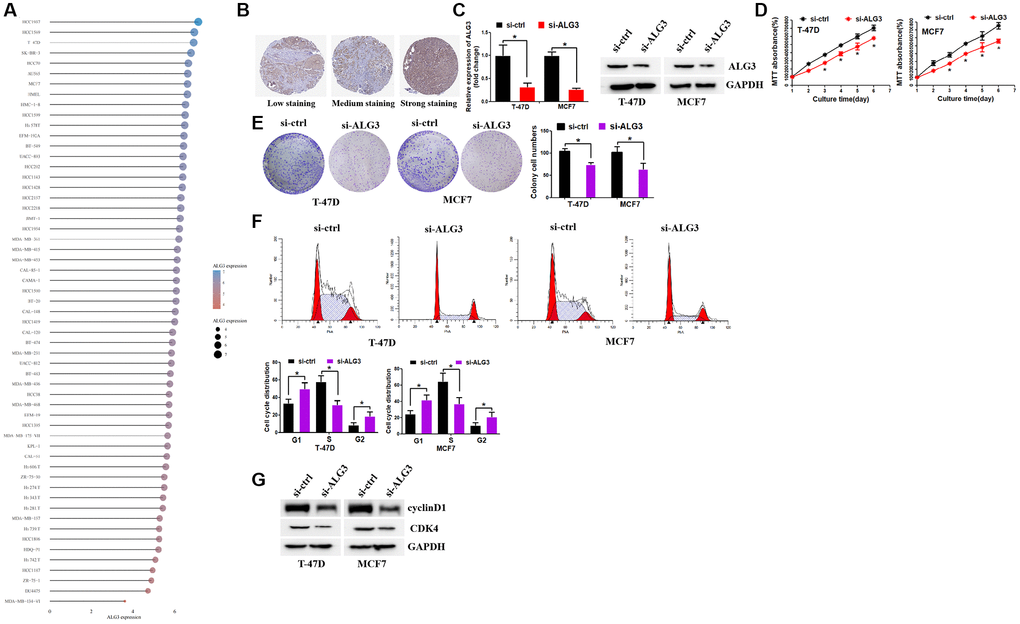 With the use of the CCLE database, we revealed the elevation of ALG3 expression in most kinds of breast cancer cell lines (Figure 9A). In addition, we revealed that ALG3 expression was elevated in breast cancer samples by utilizing Human Protein Atlas (HPA) database (Figure 9B). Inhibition of ALG3 expression was achieved by using si-RNA that targets ALG3 (Figure 9C). ALG3 inhibition decreased breast cancer cell growth ability, as revealed by MTT and colony formation assays (Figure 9D, 9E). We next explored whether ALG3 contributed to cell growth by affecting cell cycle distribution. It was found that suppression of ALG3 contributed to the arrest of the cell cycle in the G1 and G2 phase (Figure 9F). Western blot assay revealed that inhibition of ALG3 decreased the expression levels of cyclinD1 and CDK4 (Figure 9G). CyclinD1 and CDK4 were key kinase that regulated cell cycle distribution and affected cell proliferation. These data implicated that ALG3 may promote breast cancer proliferation via regulating cell cycle kinase-cyclinD1 and CDK4.