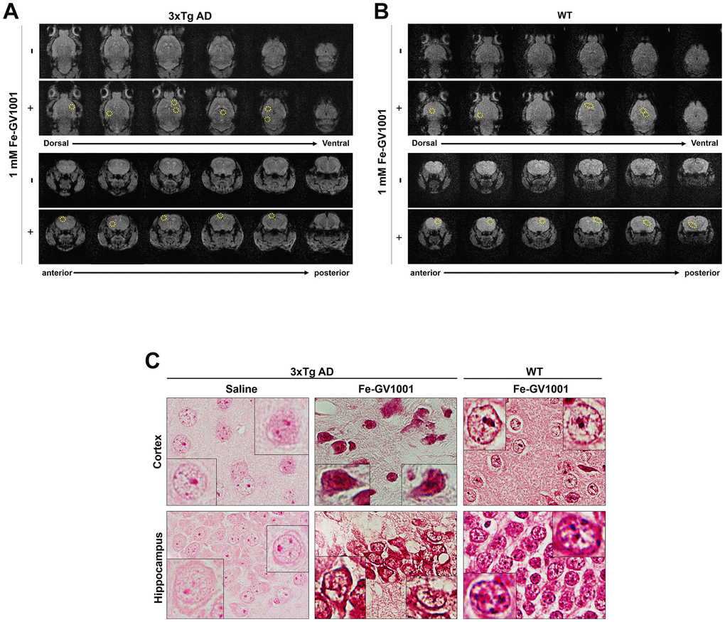 To confirm that GV1001 can enter the brain through the BBB, 200 μl of 1 mM ferrocenecarboxylic acid-conjugated GV1001 (Fe-GV1001), which has been verified to enter diverse stem cells very efficiently and can be used to track transplanted stem cells in the brain [18], was injected into the tail vein of 3xTg-AD (B6:129-Psen1tm1Mpm Tg [APPSwe, tauP301L] 1Lfa/Mmjax) and WT mice. Before and after injection, MRI was performed as previously described. MR images showed dots with low signal intensity in the brains (surrounded by yellow circles) of 3xTg AD mice (Figure 1A) and WT mice (Figure 1B) after injection (+ in the figures) compared to before it (- in the figures). These dots were confirmed to be Fe-GV1001 via Prussian blue staining (Figure 1C), and these findings showed that Fe-GV1001 entered the brain across the BBB.