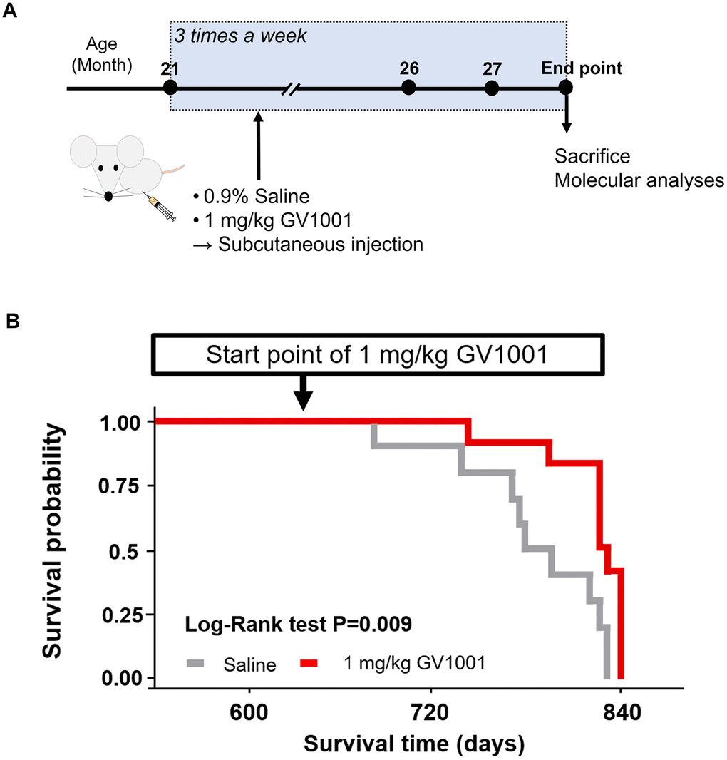 In this study, experimental 3xTg-AD mice (21 months old) were divided into two groups, with 12 animals assigned to each group. The experimental groups were as follows: 1) 0.9% saline and 2) 1 mg/kg of GV1001 (the most effective dose confirmed in another middle-aged 3xTg-AD mice study, Supplementary Figures 1, 2). GV1001 or an equivalent volume of saline was subcutaneously injected into old-aged 3xTg-AD mice three times a week from the age of 21 months to the endpoint for sacrifice, identified according to the Canadian Council on Animal Care (CCAC) guidelines (Supplementary Tables 1, 2), in a blinded manner [47]. The survival curves of old-aged 3xTg-AD mice were generated using the Kaplan-Meier method.
