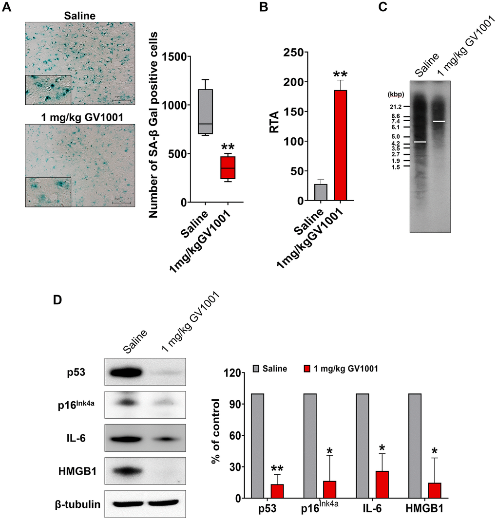 Markers used to predict cell senescence, such as SA-β-Gal, telomerase activity, telomere length, p53, p16Ink4a, IL-6, and HMGB1, were measured in the brains of old-aged 3xTg AD mice. The results showed that SA-β Gal-positive cells were significantly reduced by treatment with 1 mg/kg GV1001 compared to saline treatment (Figure 5A). Telomerase activity, which is essential to maintain telomere length, and telomere length, which is well known to decrease with senescence of cells, were improved in the brains of old-aged 3xTg AD mice treated with 1 mg/kg of GV1001 (Figure 5B, 5C). Intracellular markers of senescence, such as p53, p16Ink4a, IL-6, and HMGB1, were considerably decreased in the brains of old-aged 3xTg AD mice treated with 1 mg/kg of GV1001 (Figure 5D). These results suggest that the effect of GV1001 on neurodegeneration in the brains of old-aged 3xTg AD mice may be related to its anti-senescence activity.
