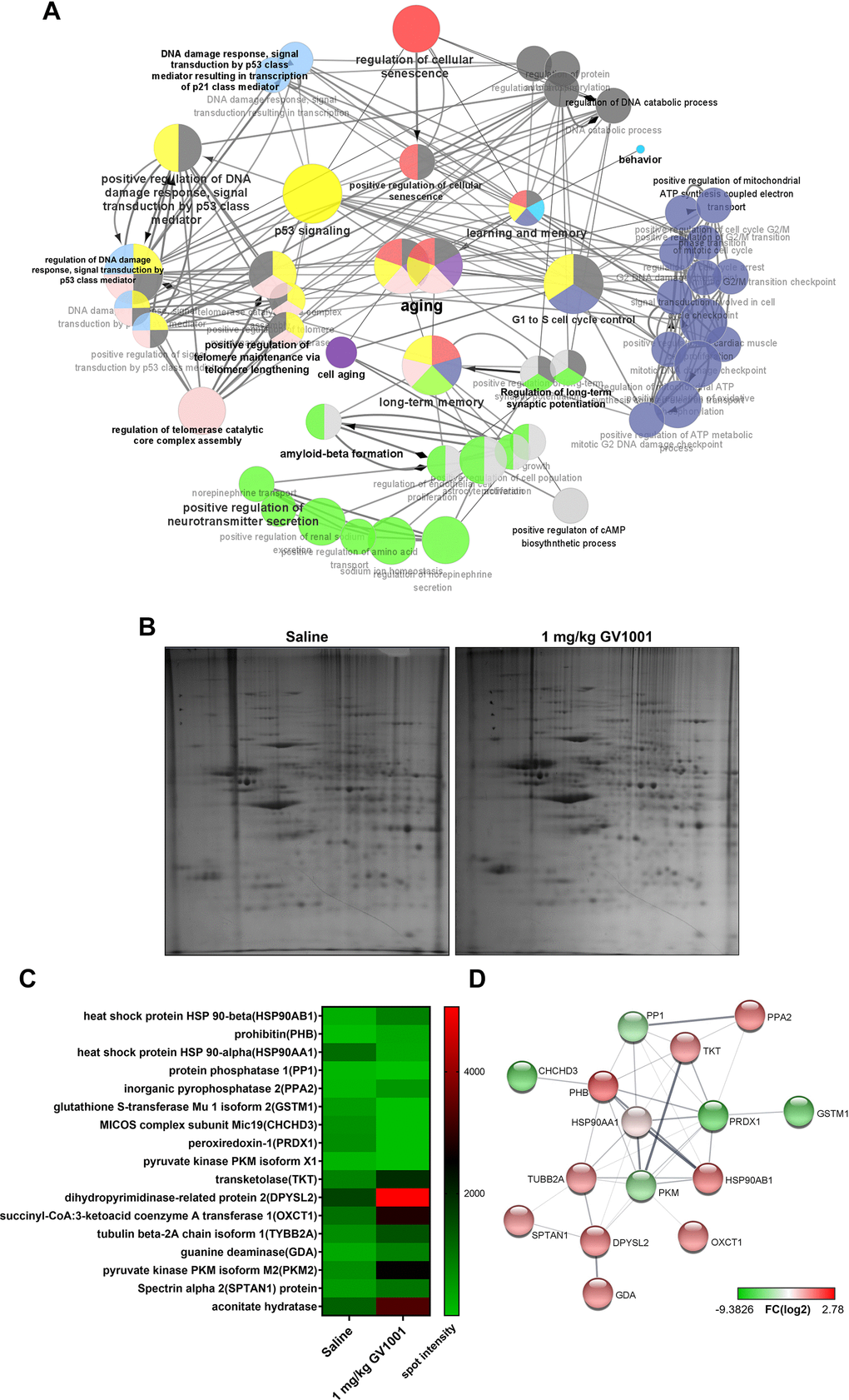 Proteomics also confirmed that this effect of GV1001 in the brains of 3xTg AD mice was achieved through diverse intracellular signalling pathways (Figure 6B–6D). The heat map shows protein levels (Figure 6B). Protein expression values were log2-transformed. Red indicates a high expression level, and green indicates a low expression level (Figure 6C). The survival-related proteins including prohibitin [20, 21], dihyropyridinase-realated protein 2 (DPYSL2) [22], transketolase [23], pyruvate kinase isoform M2 (PKM2) [24], spectrin alpha 2 (spna2) [25] and aconitate hydratase [26] were increased with GV1001 treatment. STRING analysis showed up- and downregulated protein–protein interaction networks. Upregulated and downregulated proteins were clustered based on the STRING evidence score (Figure 6D).