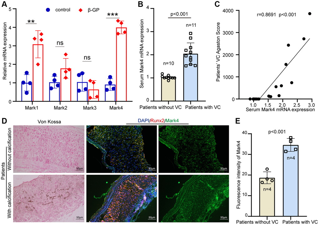 First, the expression levels of Mark mRNA (Mark1-4) in human VSMCs mediated by β-GP were gauged by Realtime-quantitative Polymerase Chain Reaction (RT-qPCR). As shown in Figure 1A, Mark4 mRNA expression was the most significantly elevated among the four Mark family members. To preliminarily investigate the relationship between Mark4 and VC, Mark4 expression was measured in serum samples from 21 CKD individuals with or without VC. The characteristics of the CKD patients were shown in Table 1. Patients with VC presented dramatically higher Mark4 levels than controls without VC (Figure 1B). Interestingly, Mark4 expression was positively correlated with the increased severity of VC (P < 0.001; Figure 1C). To further clarify whether Mark4 took a crucial part in VC, we evaluated Mark4 and Runx2 (osteogenic marker) expression in calcified radial arteries from patients undergoing an arteriovenostomy before hemodialysis. Von Kossa assays were employed to identify matrix mineral deposition, and immunofluorescence (IF) staining for Mark4 and Runx2 was performed in arterial tunica media. The arteries with calcification arteries exhibited significantly elevated Mark4 (green fluorescence) and Runx2 (red fluorescence) staining intensity compared with those without calcification (Figure 1D, 1E). Collectively, these data suggested that Mark4 might be involved in VC progression among patients with CKD.