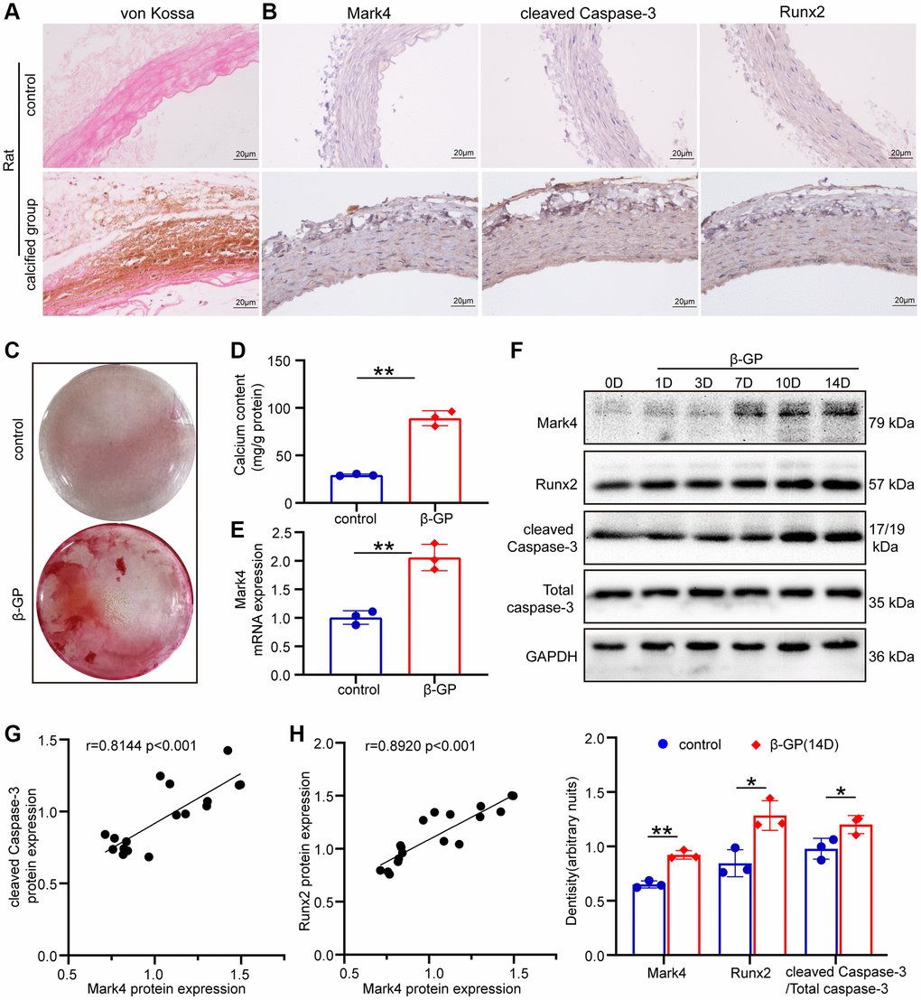 As previous evidence showed, Mark4 regulated the expression of apoptosis-related genes [16], and cleaved Caspase-3 is a molecular marker of cells undergoing apoptosis [3, 30]. Therefore, we first detected cleaved Caspase-3 and Mark4 expression in the calcified aortas of CKD rats (Figure 2A). As shown in Figure 2B, cleaved Caspase-3 and Mark4 levels were distinctly increased in the calcified arteries compared with those in the control group, accompanied by the upregulated expression of Runx2. In vitro cell experiments, we further corroborated that high-phosphorus medium configurated by 10 mM β-glycerophosphate (β-GP) successfully induced VSMCs calcification, evidenced by elevated red calcium nodes and the quantitation of calcium content (Figure 2C, 2D); additionally, Mark4 mRNA levels were markedly increased (Figure 2E). Similarly, the protein levels of Mark4 in VSMCs treated with high β-GP gradually increased in a time-dependent manner, parallel with the upregulation of cleaved Caspase-3 and Runx2 (Figure 2F). Moreover, correlation analysis revealed that Mark4 positively correlated with cleaved Caspase-3 and Runx2 expression in VSMCs incubated with high phosphorus (Figure 2G, 2H). Taken together, these observations indicated that Mark4 might participate in VSMCs apoptosis and calcification.