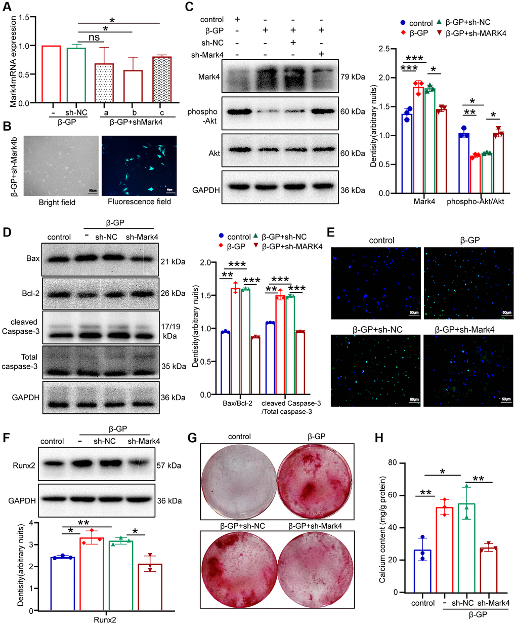 To probe whether Mark4 played a critical role in high phosphate-mediated Akt phosphorylation and the expression of apoptotic protein, including Bax, Bcl-2, and cleaved Caspase-3 in VSMCs, three independent shRNAs against Mark4 (sh-Mark4a-c) were adopted. The efficiency was validated at the mRNA level, and sh-Mark4b was chosen for the subsequent experiments (Figure 3A). After transfection with sh-Mark4b successfully, VSMCs showed bright green fluorescence with a transfection efficiency approaching 50% (Figure 3B). The data in Figure 3C, 3D showed that Mark4 knockdown reversed the effect of high phosphate on the inhibition in Akt phosphorylation and reduced Bax/Bcl-2 and cleaved Caspase-3 levels, thus alleviating VSMCs apoptosis. Similarly, the TUNEL assay showed that Mark4 deficiency mitigated VSMCs apoptosis (Figure 3E). Meanwhile, Mark4 silencing suppressed the expression of the osteogenic marker Runx2 and attenuated calcium nodule formation and calcium deposition, as determined by Western blot, alizarin red staining and calcium assay, respectively (Figure 3F–3H). These results represented that Mark4 promoted VSMCs apoptosis and calcification probably through inhibiting the antiapoptotic effect of Akt signaling in β-GP-stimulated conditions.