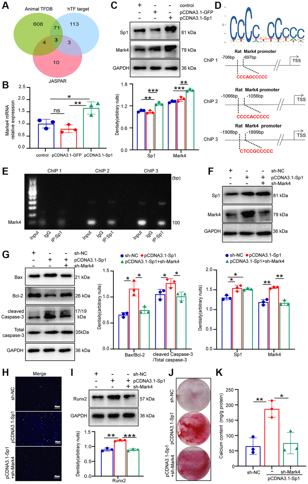 To uncover the potential molecular mechanism of Mark4 regulation in VSMCs calcification, bioinformatics (AnimalTFDB4, https://guolab.wchscu.cn/AnimalTFDB4/#/, hTFtarget, http://bioinfo.life.hust.edu.cn/hTFtarget#!/ and JASPAR, https://jaspar.genereg.net) were employed to predict the transcription factors that regulated Mark4 expression (Figure 4A). Combined with the predicted results, the Sp1, Glucocorticoid Receptor (NR3C1) and Estrogen Receptor 1 (ESR1) genes were highly associated with the expression of Mark4. Considering that Sp1 has been reported to play a vital role in the pathogenesis of VC [31], we focused on Sp1 as a potential molecule targeting Mark4 transcription. To investigate whether Sp1 was involved in modulating Mark4 levels, we carried out gain-of-function approaches. Overexpression of Sp1 enhanced Mark4 mRNA and protein expression, as shown in Figure 4B, 4C. Then, we sought to explore the molecular mechanism by which Sp1 modulated Mak4 transcription. Bioinformatics screening demonstrated that Sp1 might target three binding sites (marked as ChIP 1, 2, and 3) in the Mark4 promoter region (Figure 4D). ChIP-PCR assay validated that the enrichment of Sp1 detected within ChIP 3 (from-1908 bp to-1899 bp) was markedly stronger than that detected within ChIP1 and 2 (Figure 4E), further indicating that Sp1 amplified Mark4 expression via transcriptional activation. Subsequently, a further rescue experiment was conducted to define whether Sp1 facilitated apoptosis and calcification of VSMCs through promoting Mark4 expression. We downregulated Mark4 and simultaneously overexpressed Sp1, revealing that sh-Mark4 neutralized the effect of Sp1 overexpression on VSMCs apoptosis (Figure 4F–4H). Meanwhile, Mark4 silencing antagonized the increase in Runx2 levels and calcium nodule formation caused by Sp1 elevation (Figure 4I–4K). Collectively, these results demonstrated that Sp1 upregulation elevated Mark4 expression through transcriptional activation, then participating in the process of apoptosis and calcification in high phosphate-mediated VSMCs.