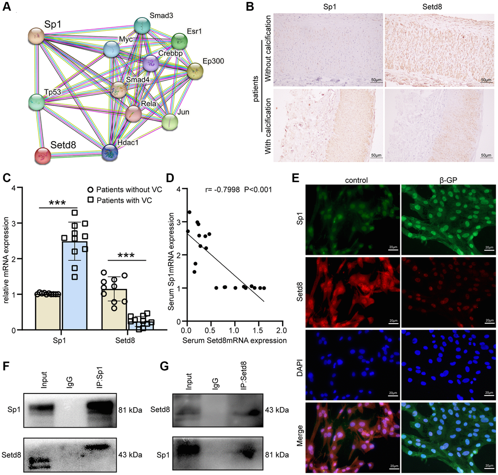 In the predicted results, Setd8 has been demonstrated to be responsible for VSMCs calcification, which is consistent with our previous studies; thus, we hypothesized that Setd8 interacted with Sp1. Initially, immunohistochemistry assay verified that Sp1 was increased and Setd8 was decreased in the aortic tissues of CKD-VC patients (Figure 5B). Similarly, elevated Sp1 mRNA and reduced Setd8 mRNA levels were observed in the serum of patients with CKD-VC (Figure 5C). Moreover, correlation analysis showed that serum Sp1 mRNA was significantly correlated with Setd8 mRNA (Figure 5D), suggesting a strong relationship between them. To further clarify the association of Sp1 and Setd8, we operated immunofluorescence double-staining assay. As expected, Setd8 co-localized with Sp1 in the nucleus of VSMCs treated with β-GP, manifesting as decreased red fluorescence intensity (Setd8) and increased green fluorescence intensity (Sp1) compared with that in the control group (Figure 5E). In addition, co-immunoprecipitation assays further confirmed that Setd8 and Sp1 have a reciprocal interaction in VSMCs (Figure 5F, 5G). Taken together, these data suggested that Setd8 interacted with Sp1 to participate in the modulation of Mark4 expression.