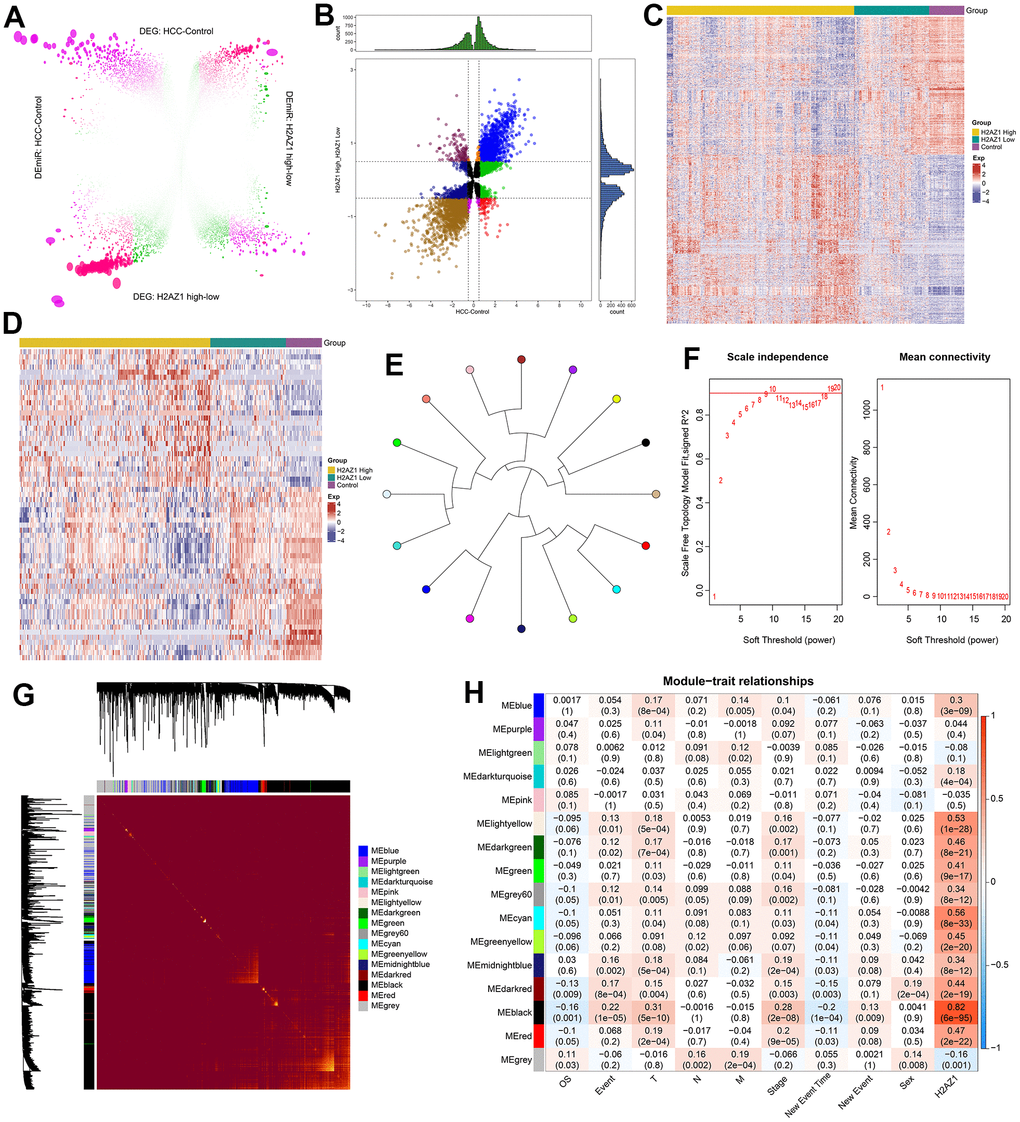 Weighted gene co-expression network analysis (WGCNA) is widely used to construct scale-free networks using gene expression data. To examine the effect of high H2AZ1 expression on gene deregulation in HCC, we used the WGCNA package [50]. The analysis used deregulated genes affected by high H2AZ1 expression in HCC. The hclust function of the WGCNA package was used to cluster samples. Subsequently, a suitable soft-thresholding power was determined to generate a proximity matrix that best matched the scale-free network characteristics of gene distribution (R2 = 0.85). Moreover, a heatmap illustrating the correlations between modules and phenotypes was generated to identify significant module-phenotype correlations. In this study, the modules that exhibited the most significant positive correlation with HCC were designated as candidate modules.