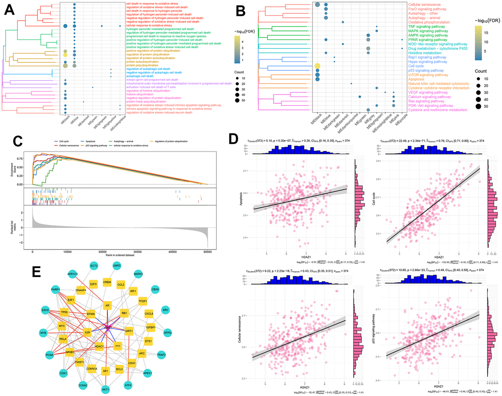 Subsequently, we performed a functional enrichment analysis of the module genes. The results showed that the black module genes were significantly enriched in biological processes related to oxidative phosphorylation and ubiquitination (P<0.05, Figure 3A), as well as pathways such as cellular senescence, cell cycle, P53 signaling pathway, and apoptosis (P<0.05, Figure 3B). Using gene set enrichment analysis (GSEA), we verified the significant activation of gene sets linked to cellular senescence, cell cycle, P53 signaling pathway, and apoptosis in the H2AZ1 high expression group (Figure 3C), suggesting that these pathways may be closely associated with H2AZ1-mediated HCC development. Correlation analysis showed that H2AZ1 expression in HCC was significantly and positively correlated with the gene set scores for apoptosis, cell cycle, cellular senescence, and P53 signaling pathway (Figure 3D). In addition, using pivot analysis, we explored the regulation of H2AZ1 in cellular responses to oxidative stress in black module genes (Supplementary Table 1) and constructed a protein-protein interaction network. These results indicated that H2AZ1 may regulate cellular responses to oxidative stress gene sets by regulating transcription factors such as JUN, YY1, and SIRT1 (Figure 3E). H2AZ1 overexpression in HCC may, thus, affect the development of tumor cells by regulating cell apoptosis, cell cycle, and aging.