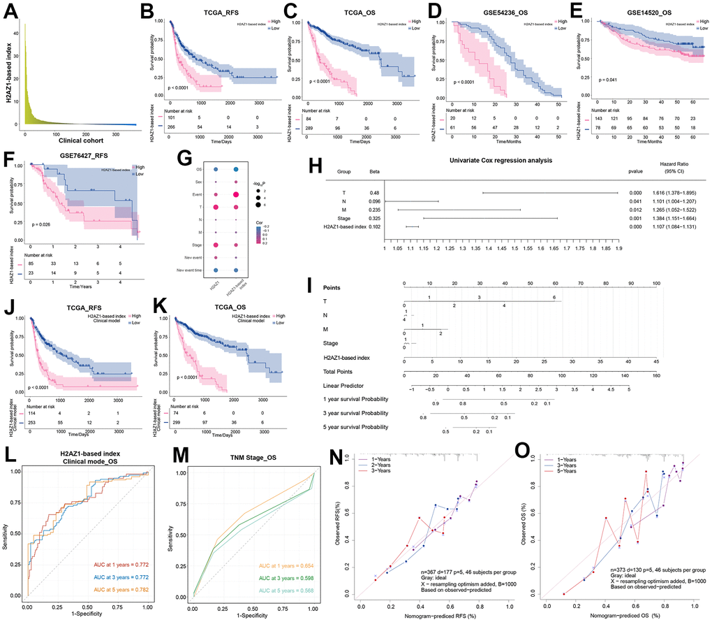 To explore the potential clinical roles of H2AZ1 and its related dysregulated genes in HCC, we performed survival analysis on these genes and selected the top 50 genes most significantly associated with HCC overall survival (OS) and recurrence-free survival (RFS) (Supplementary Table 2). We further screened these genes by univariate analysis, excluding KAT2A (P=0.029) based on a significance threshold of P<0.01, and constructed the H2AZ1-based index by Cox multivariate analysis (Supplementary Table 3). We explored the expression of this index in a clinical cohort of patients with HCC (Figure 4A). Moreover, survival curve analysis revealed that a high H2AZ1-based index was associated with poor OS and RFS in HCC (Figure 4B, 4C), which was verified in HCC-independent cohorts, such as GSE54236, GSE14520, and GSE76427 (Figure 4D–4F). Notably, this index showed a significant negative correlation with the OS of patients with HCC (Figure 4G). Univariate analysis showed that H2AZ1-based indices, such as tumor size (T), lymph node involvement (N), distant metastasis (M), and stage, could serve as independent risk factors for HCC (Figure 4H). Subsequently, based on clinical characteristics such as TNM staging of patients with HCC and the H2AZ1 index, we further established a clinical model and represented it using a nomogram (Figure 4I). Survival analysis showed that this clinical model had predictive potential for OS and RFS in HCC (Figure 4J, 4K), and the receiver operating characteristic (ROC) curve showed that this clinical model had higher accuracy than the TNM model (Figure 4L, 4M). Furthermore, the calibration curve validated the predictive accuracy of the nomogram (Figures 4N, 4O).