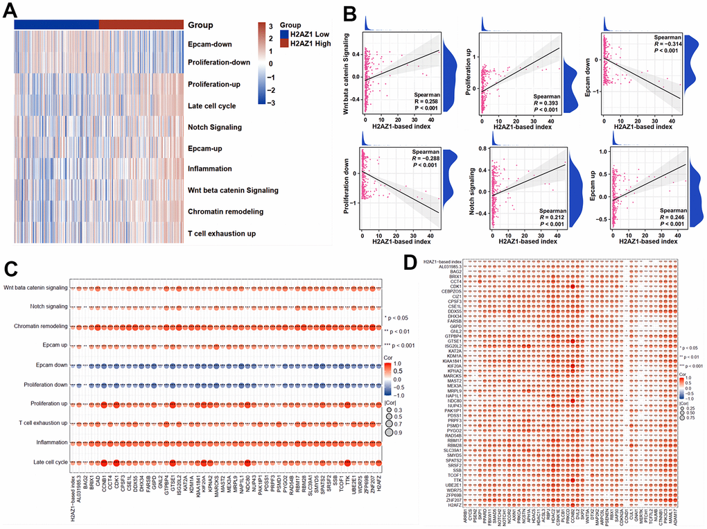 To explore the relationship between H2AZ1-based index genes and tumor stemness, we used the gene set variation analysis (GSVA) algorithm to assess stemness-related gene sets (Supplementary Table 4). The analysis showed that the high H2AZ1-based index group had higher scores in stemness, particularly in the Wnt and Notch signaling pathways (Figure 5A). In addition, correlation analysis showed that the high H2AZ1-based index group was positively correlated with the Wnt signaling pathway, Notch signaling pathway, Epcam upregulation, and proliferation upregulation signals. Conversely, it was negatively correlated with Epcam downregulation and proliferation downregulation signals. These findings suggest that the poor prognosis observed in the high H2AZ1-based index group might be related to the activation of tumor stemness-related pathways (Figure 5B). Further correlation analysis indicated that the genes of the H2AZ1-based index were positively correlated with tumor stemness pathways and stemness-related genes (Figure 5C, 5D). These results suggest that the increased expression of H2AZ1 index genes in HCC may enhance the stemness of tumor cells, thereby promoting HCC progression.