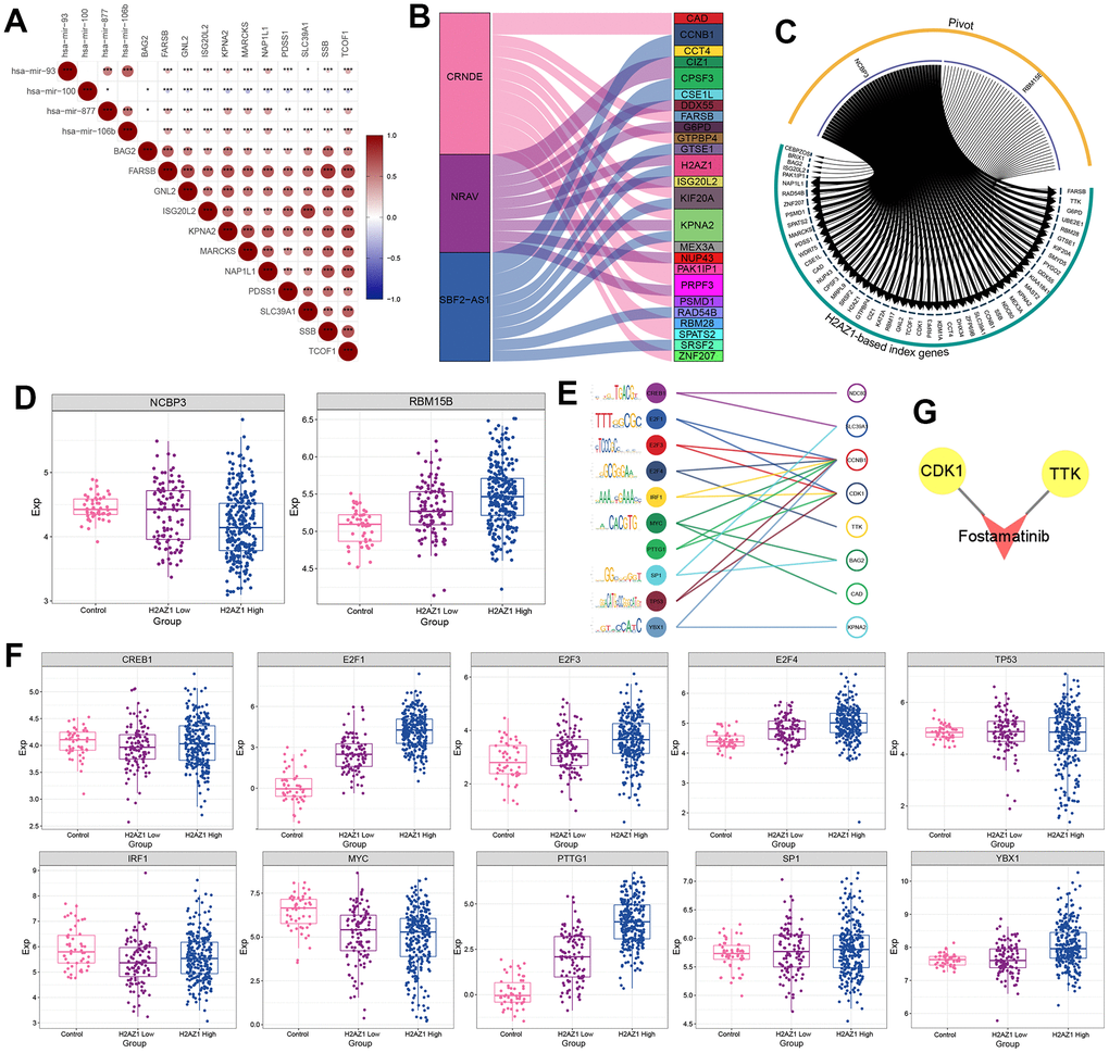 Subsequently, we explored the upstream regulators of the H2AZ1-based index gene set, including miRNAs, lncRNAs, RNA-binding proteins (RBPs), and transcription factors (TFs), using pivot analysis. The results showed that the upstream miRNAs regulating the H2AZ1-based index gene set included hsa-mir-93, hsa-mir-100, and hsa-mir- 877 (Figure 6A). The upstream lncRNAs included CRND1, NRAV, and SBF2-AS1 (Figure 6B), and the RBPs included NCBP3 and RBM15B (Figure 6C). Notably, NCBP3 targeted UBE2E1, a gene encoding the ubiquitin-conjugating enzyme E2E1. The expression level of NCBP3 was low in the H2AZ1 high-expression group, whereas the expression level of RBM15B was increased in the control, H2AZ1 low-expression, and H2AZ1 high-expression groups (Figure 6D). In addition, 10 TFs, including CREB1, E2F1, and E2F3 regulated genes in the H2AZ1-based index (Figure 6E, 6F). We also explored potential drug targets in the H2AZ1-based index gene set, including CDK1 and TTK (Figure 6G).